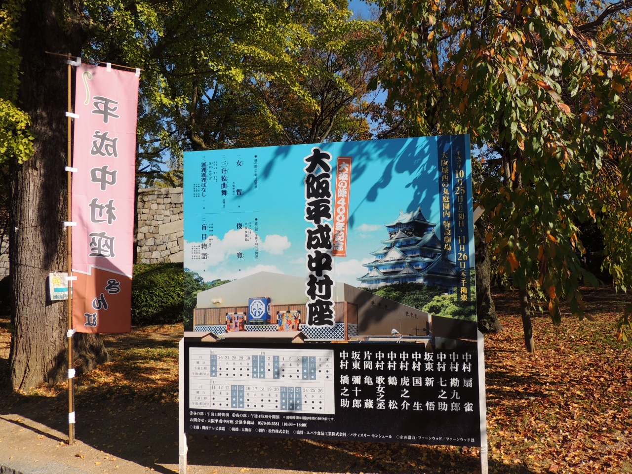 中村屋の歌舞伎をやっているということで庭園入口の手前に歌舞伎の観覧券売り場が設けられていた。また、黄金の茶室は、天守閣の中には展示されておらず、この時期はこの庭園の中に展示されているので、別に料金が必要になった。