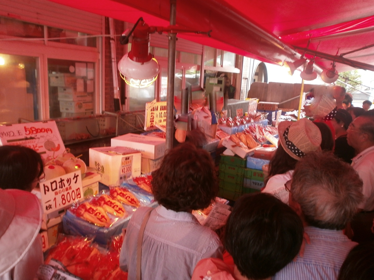 JR函館駅や函館港の近くの一角に、カニやホッケ、いかなどの海産物や、赤肉メロンやとうもろこしなどを売っているお店が建ち並ぶ朝市がありました。それぞれの店から活気のいい声で商品の宣伝をされていました。関西ではあまり見られない特大のカニやホッケを見て回るだけでも楽しくなってきました。メロンが切られて売っていたので、食べ歩きをしました。甘くておいしかったです。