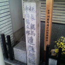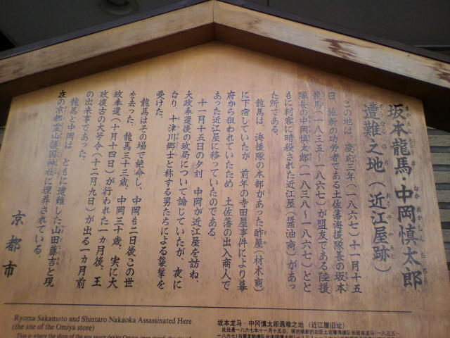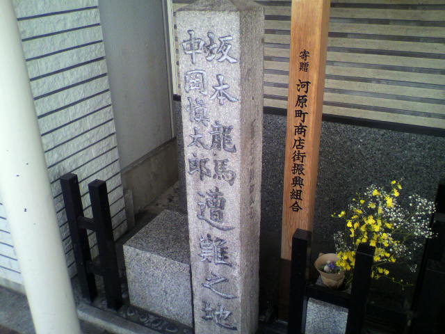 河原町通りの四条から少し上がったところに「坂本龍馬中岡慎太郎遭難之地」という石碑が建っています。慶応3年(1867年)の11月15日、この地にあった醤油商の近江屋で、土佐藩のこの2人が襲撃されました。