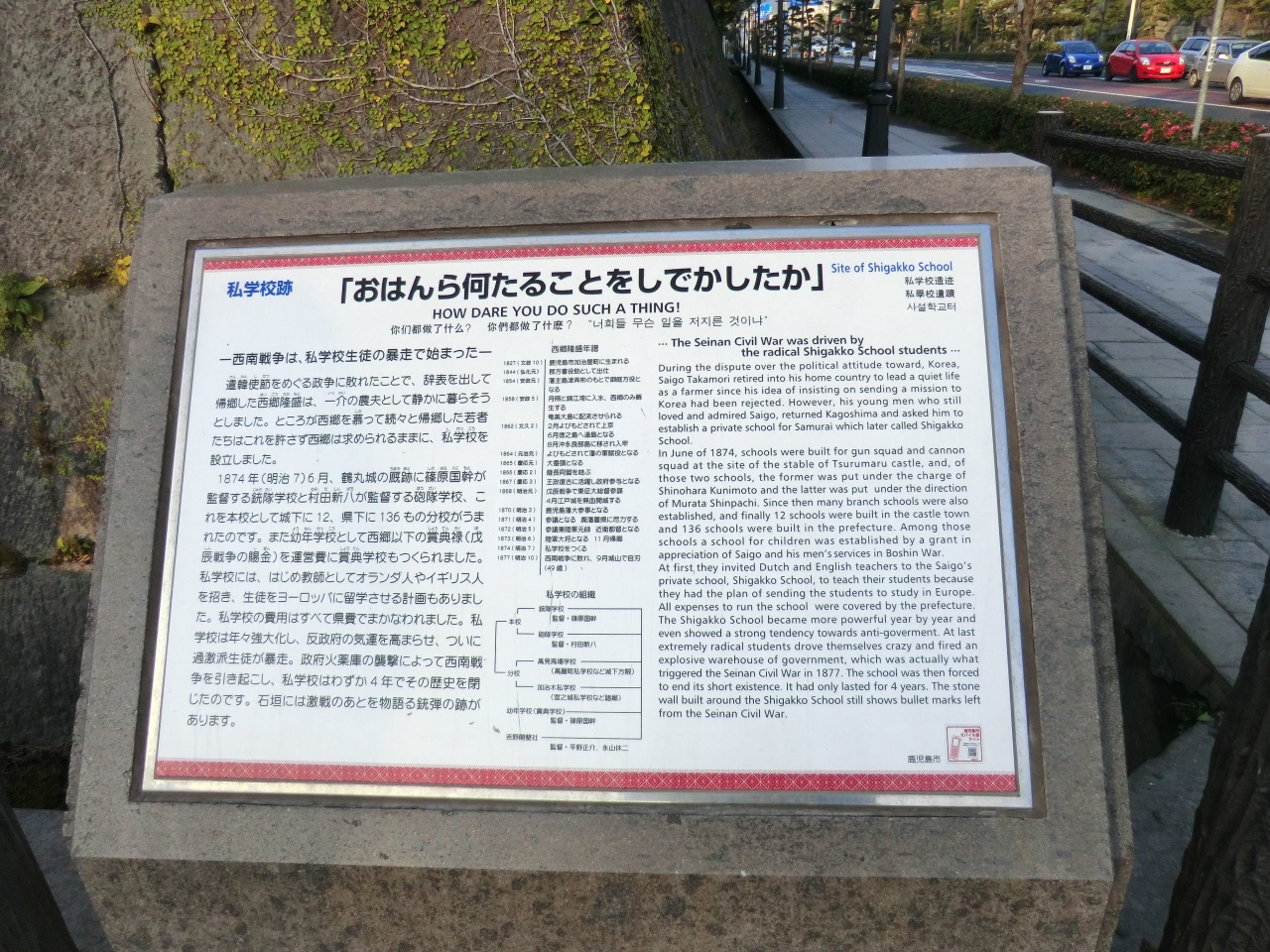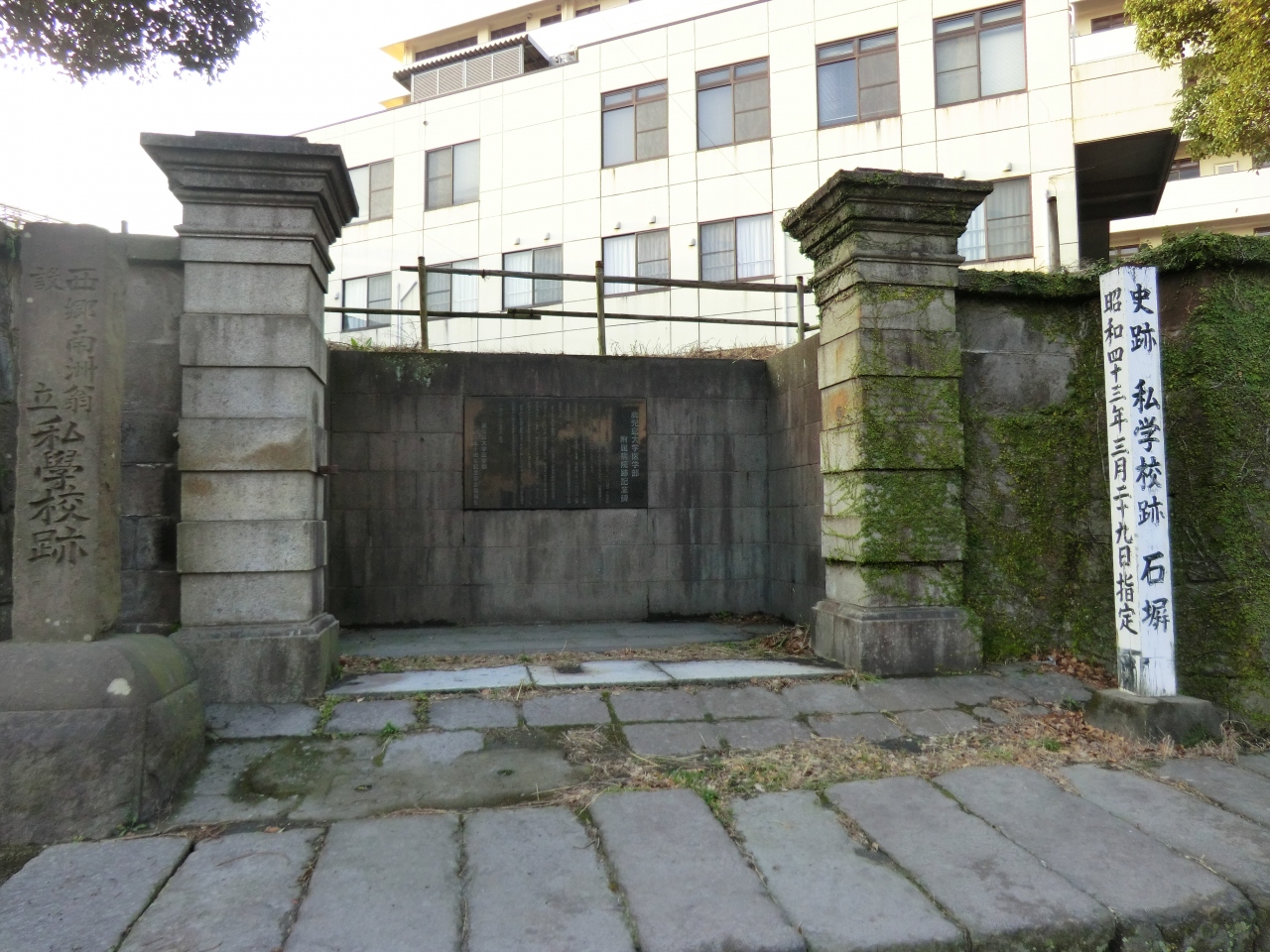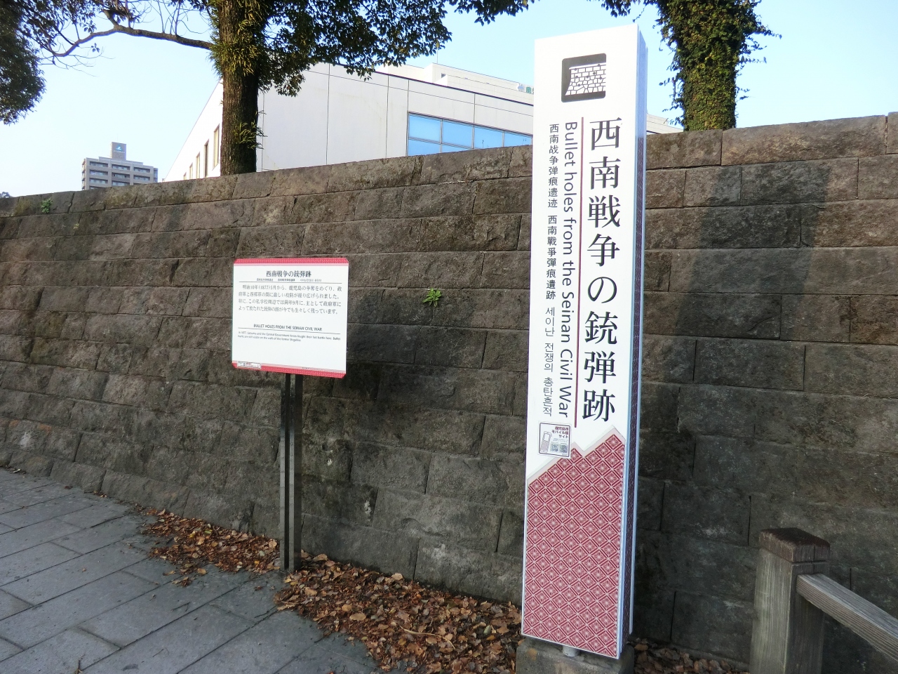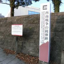 鶴丸城跡(厩跡)にあります。明治7年、征韓論が政府に取り下げられたために職を辞して下野した西郷隆盛は、薩摩士族のため、この地に軍事教練施設である「私学校」を創設しました。その後、私学校徒たちによって西南戦争が引き起こされますが、その際、この私学校の石垣に多くの銃弾が打ち込まれ、その痕跡が今なお、生々しく残っています。現在その跡地は、鹿児島医療センターとなっています。