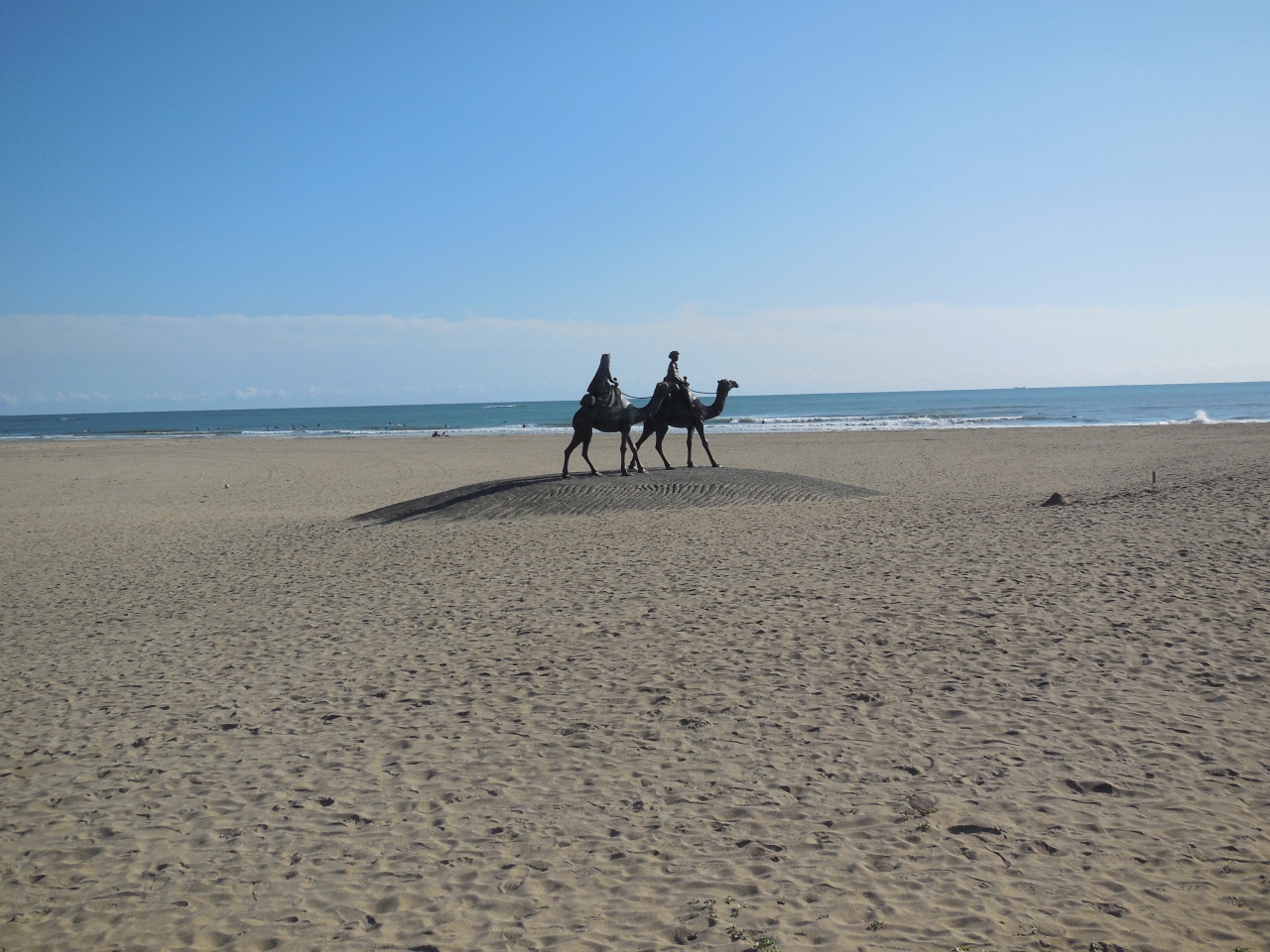 加藤まさをが童謡「月の沙漠」がこの地で書かれたとのことで、ラクダに乗る王子と王女の像が砂浜にあります。夏場は海水浴を目的とした家族連れで一杯になりますが、それ以外のシーズンは砂浜を訪れる観光客は少なく、サーファーと砂浜を歩く観光客がまばらにいる程度です。海岸の規模もそこそこあってのんびりできるとことですね。