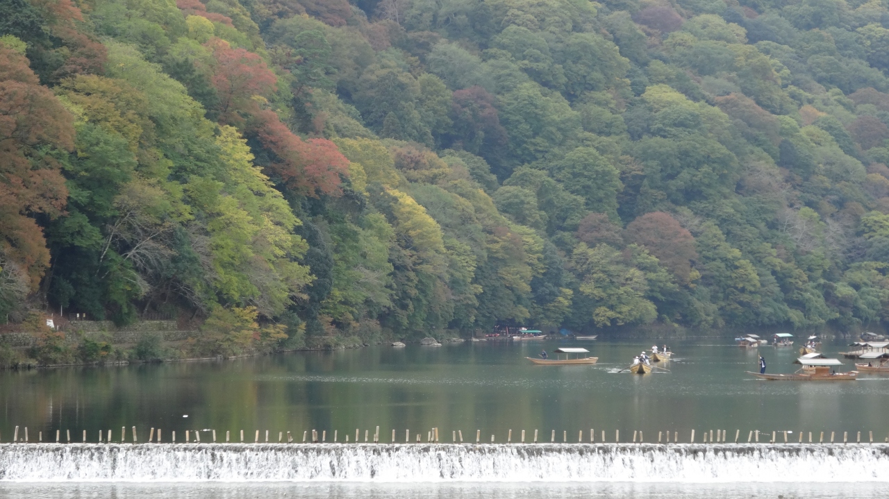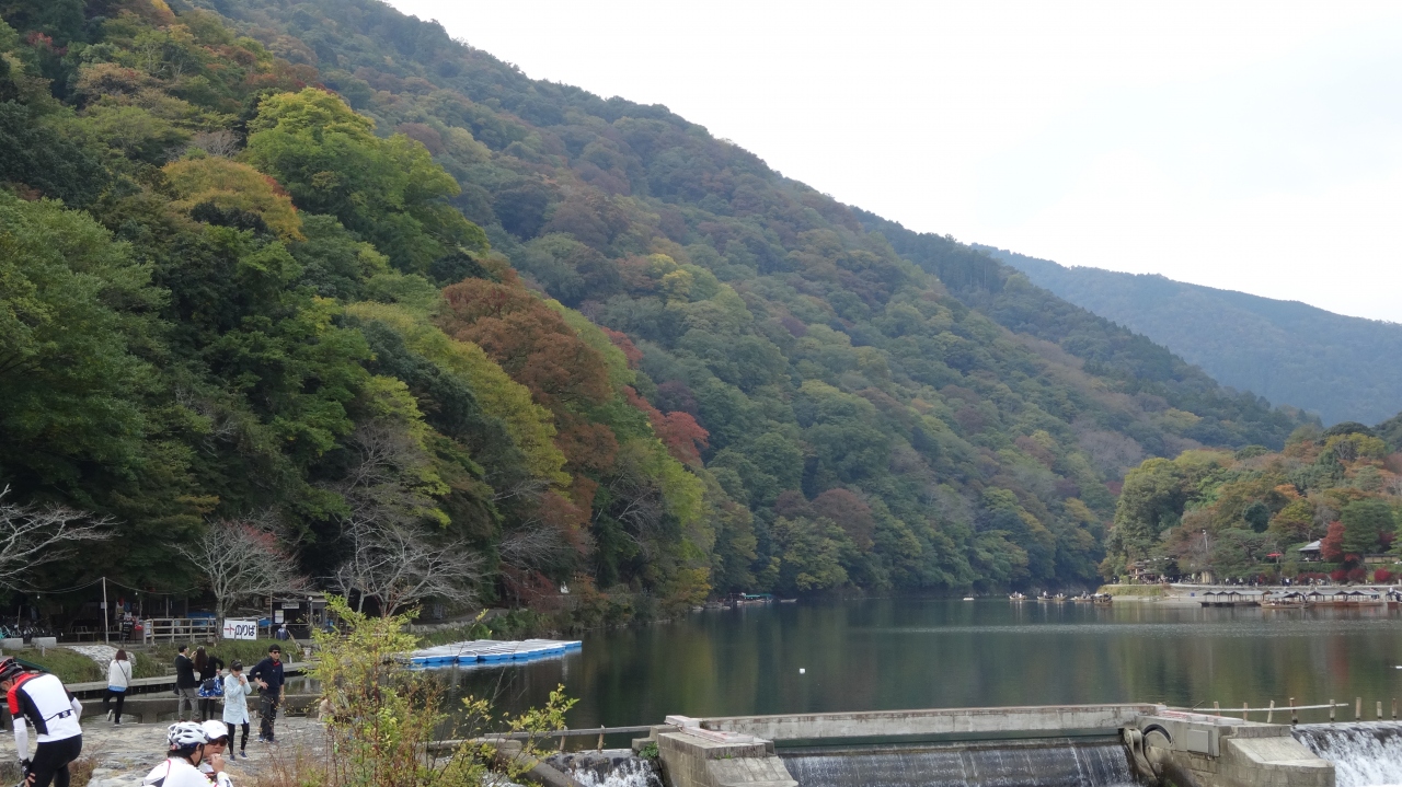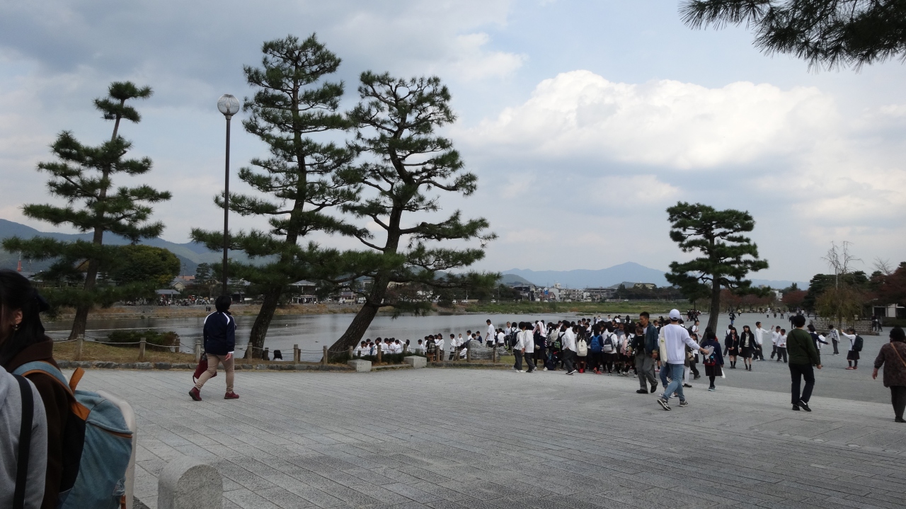 ここは桂川の渡月橋がかかる嵐山公園中之島地区になります。渡月橋を訪れた観光客が一休みするところになっているようで、修学旅行生が沢山休んでいました。嵐山の紅葉を背景に桂川にかかる渡月橋を写真におさめれば嵐山地区を制覇したようなものですね。