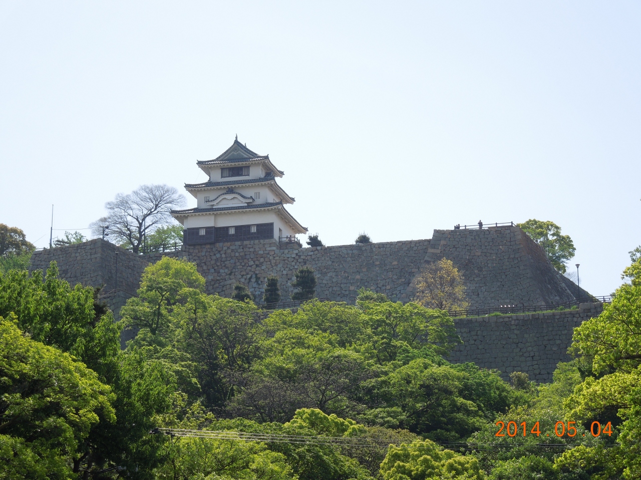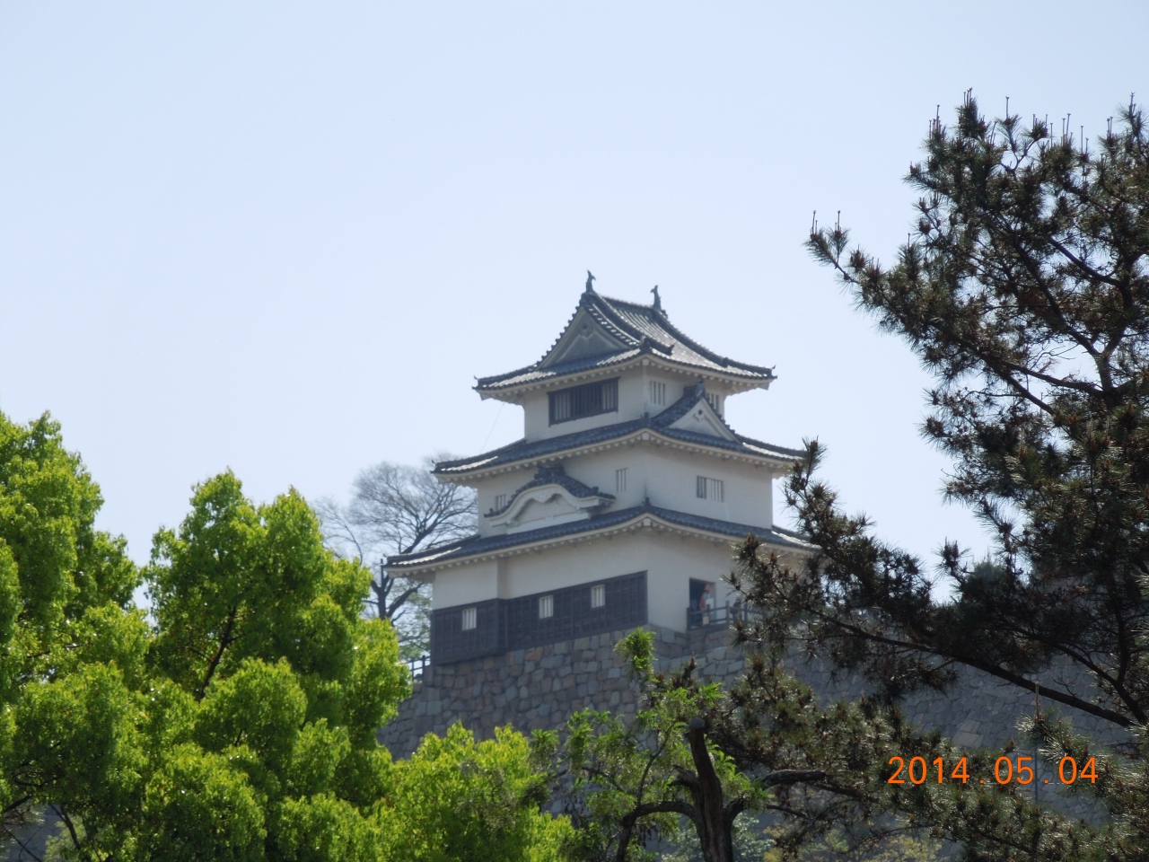丸亀城祭りと重なり城周辺の駐車場は、朝一番なのに(祭りのスタッフで?)満車。近くの小学校の校庭が臨時駐車場になっていました。祭り一色で城跡を楽しむ雰囲気ではありませんでしたが、それでも見事な高石垣を堪能しながら急坂を上り本丸に上がると、何と天守わきにも舞台が設営されていました。あらあら・・・。しかし、小さいながらもさすがの現存天守、小振りながら凛としたたたずまい、素晴らしいです。