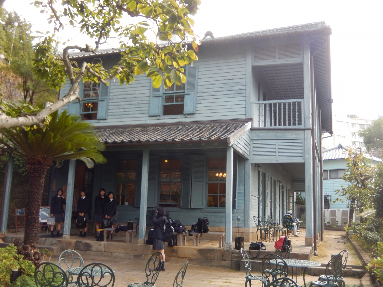 オランダ通りからオランダ坂を登った所にある青い洋風の建物、かつてはフランス領事館だったこともあります、入館は無料で、現在はカフェやギャラリー、休憩所として利用されています、庭やテラスの椅子がありのんびり出来ます。