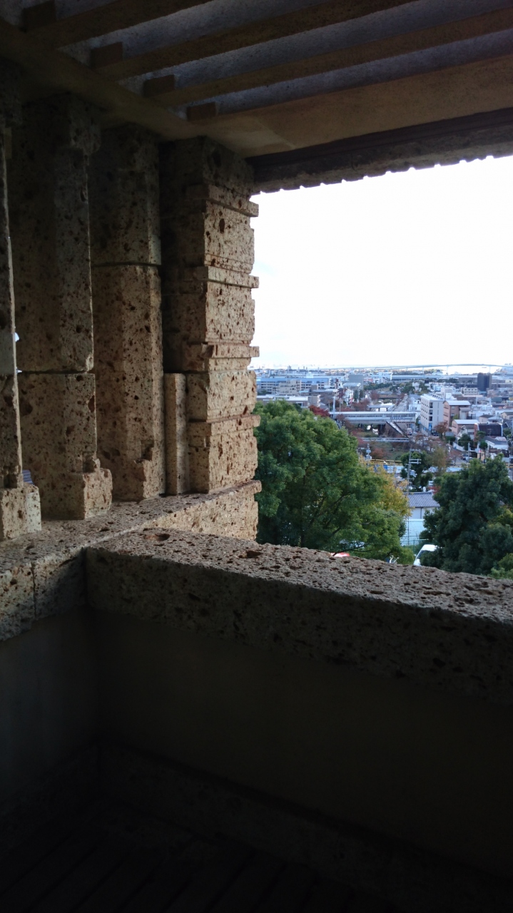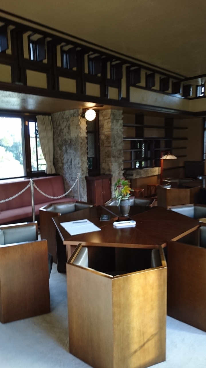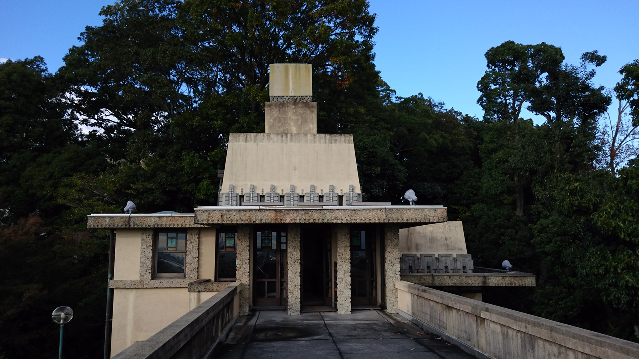 アメリカの建築家フランク・ロイド・ライトが設計した別荘で芦屋川を見下ろす高台にある。大正13年竣工で阪神大震災の被害を受けたが大規模な修復を受けて平成10年より週に3日公開されている。いつもは桜の季節にお雛様が展示されているときに行っていたが、今回はじめて秋に訪れた。ライトの設計の建物の模型が展示されていた。建物は高台の斜面に4階建ての細長い建物。大谷石に彫刻を施し、独特な雰囲気の外観と銅板やマホガニーを使った内装や建具や家具はライトらしい。各階のバルコニーや屋上からは芦屋の街並みや六甲山、大阪湾が見下ろせて眺めも雰囲気も良い。桜の季節は眼下の芦屋川が桜で埋まったように見えるが、秋には桜が紅葉しており、建物の周辺の紅葉も美しい。今年の秋の公開日の土曜日には夜間公開もあったようで、来年も公開されるようであればぜひ行ってみたいと思った。