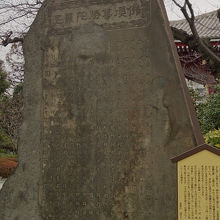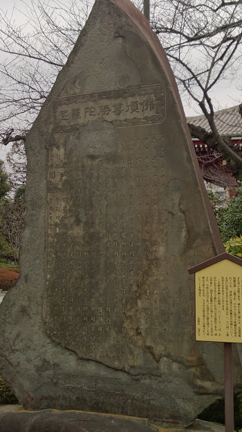 浅草寺の境内の西側のエリアにあります。本堂や宝蔵門周辺と違い、ちょっと離れたこの場所に来ると賑やかさをなく落ち着いています。それでも浅草寺の境内だけに人はそこそこ居ます。こちらの碑は造られて200年近く経過しているので、経年劣化は否めないですが、かなり大きくて立派な押し出し感のある石碑です。石碑自体は仏頂尊勝陀羅尼と題字がありその下の梵字が記されています。唱える人に息災延命のご利益があるとのことで信奉されていたお経です。説明板がすぐ横にあるのでそれを読むとこの碑のことが良くわかります。