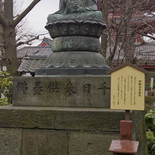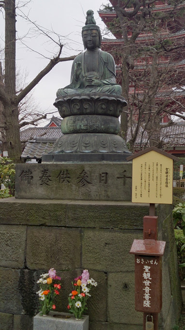 広い浅草寺の境内には、大小さまざまな社、お堂、祠、記念碑、仏像などたくさんあって、東京随一のお寺だけにその歴史の過程で設置されてきたことが想像できます。特に本堂の西側の境内はこれらが適所に配置されており、ゆっくり見て巡るだけでもかなりの時間がかかります。こちらはその一つで、西側エリアで完全に屋外に設置の仏像は少なく、こちらはその一つで、ブロンズ製の比較的大きなものです。仏様のお顔が、ほんわか優しい感じに見えます。また風雨にさらされて青銅の色が自然に出ているところが良いと思います。