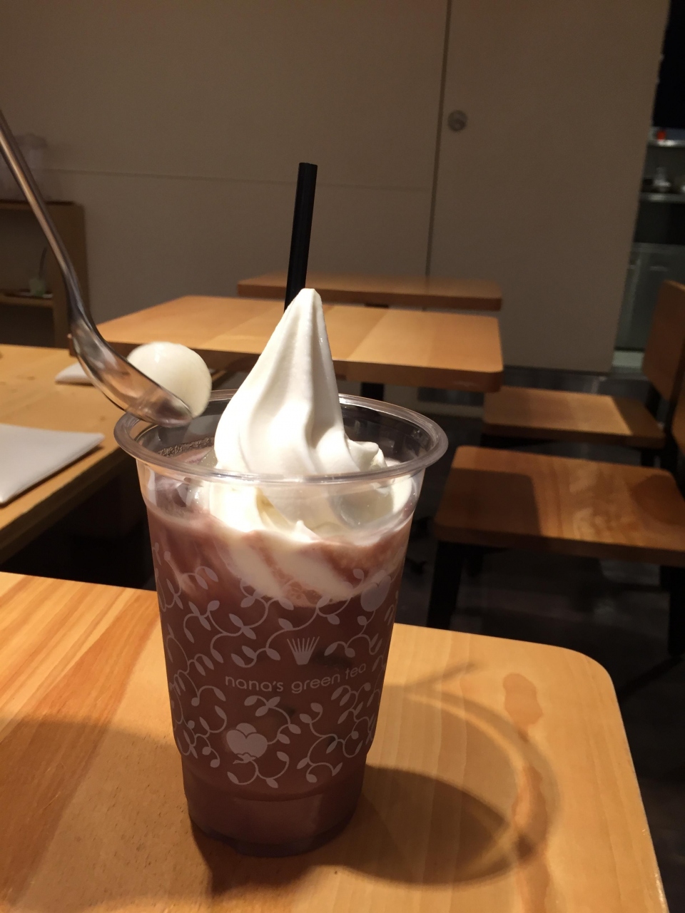 最近あちこちで見かけるようになったナナズ・グリーンティー。今回はマルイシティ横浜店に行きました。ランチできるお店はたくさんあるけれど、軽くお茶やデザートのみとなると困る横浜。東口で買い物をした後、立ち寄りました。マルイの2階という場所柄か、そんなに混んでなくてゆっくりできました。今回はソフトクリームしるこなんてものを頼んでみましたが、思った以上に美味しかった!