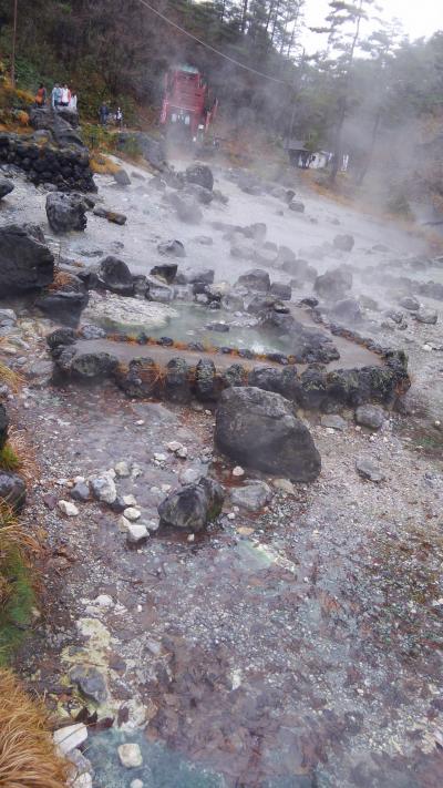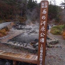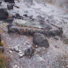 公園内からはいたるところから温泉が自分していて、あたり一面湯煙と硫化水素の香りが漂っています。また、お社や仏様等も安置されています。