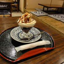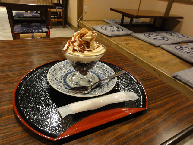 お城の中にある素朴な雰囲気の茶屋です。平日、15時過ぎは見学者も少なく茶屋も貸切状態でした。岡山の桃やフルーツを生かしたお城パフェがお勧めのようですが、珈琲味のぜんざい等和風スィーツもメニューにありました。宇喜多サンデーは珈琲味の小豆にソフトクリームと黒蜜、きびだんごがのっていました。珈琲と小豆の組み合わせも美味しいものですね。食べ応えもありました。お城見学後のお楽しみにどうぞ、お城のチケット購入しないと茶屋には行けません。