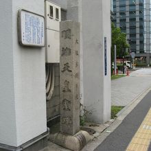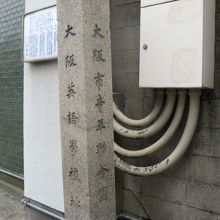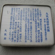 説明版には、『大阪英語学校跡(中等・高等教育発祥の地) この地に、明治七年十月、大阪英語学校のが設置された。起源は、明治二年大阪天満に開設の大阪府立洋学校にさかのぼることができる。この学校では、単に語学だけでなく外国語による一般教科目の授業が行われ、広く西日本各地から生徒が集まる特色ある存在であった。大阪英語学校という名称は、明治十二 年まで続いたが、その後、次々と名称が変わり、ついに、明治二十二年には、学校そのものが京都に移され、やがて第三高等学校(現在の京都大学)となった。』と記されています。