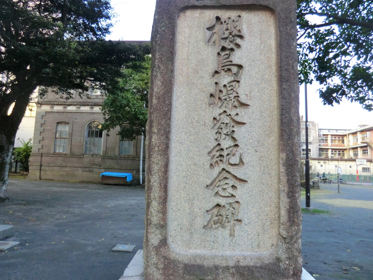 鹿児島県立博物館考古資料館の脇に「桜島爆発紀念碑」が立っています。この石碑は、大正3年1月12日の桜島大噴火の惨状を後世に残すために大正5年12月に建てられたもので、石碑の前面には「桜島爆発紀念碑」書かれています。碑文には桜島爆発の様子だけでなく、流言飛語が飛び交う人々の様子も記述されています。
