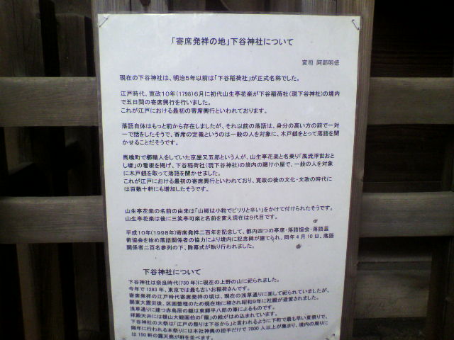 寛政10年(1798年)の6月に、初代・山生亭可楽がここ下谷稲荷社(現在の下谷神社)の境内で5日間の寄席興行が行われ、これが、江戸における最初の寄席興行だそうです。