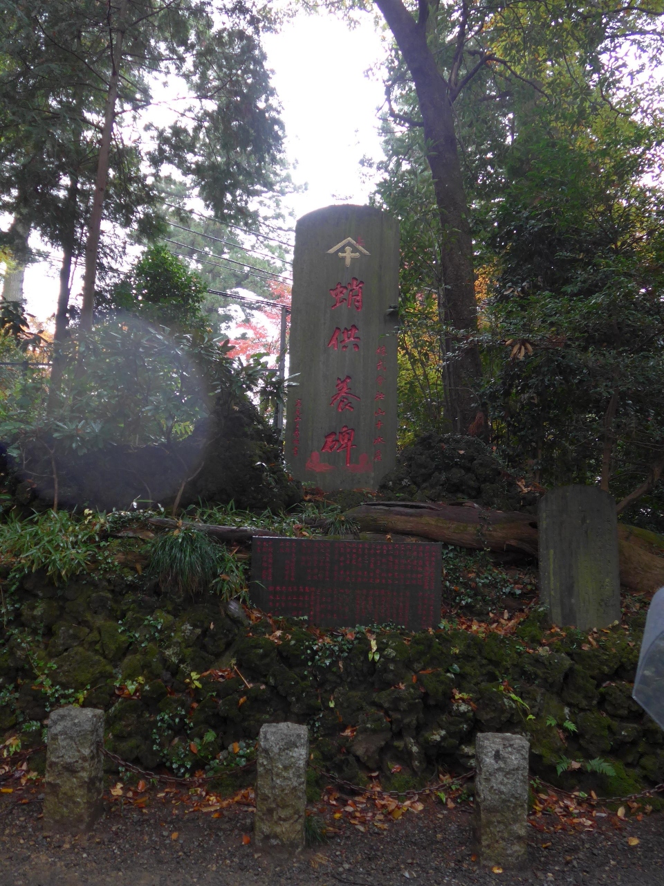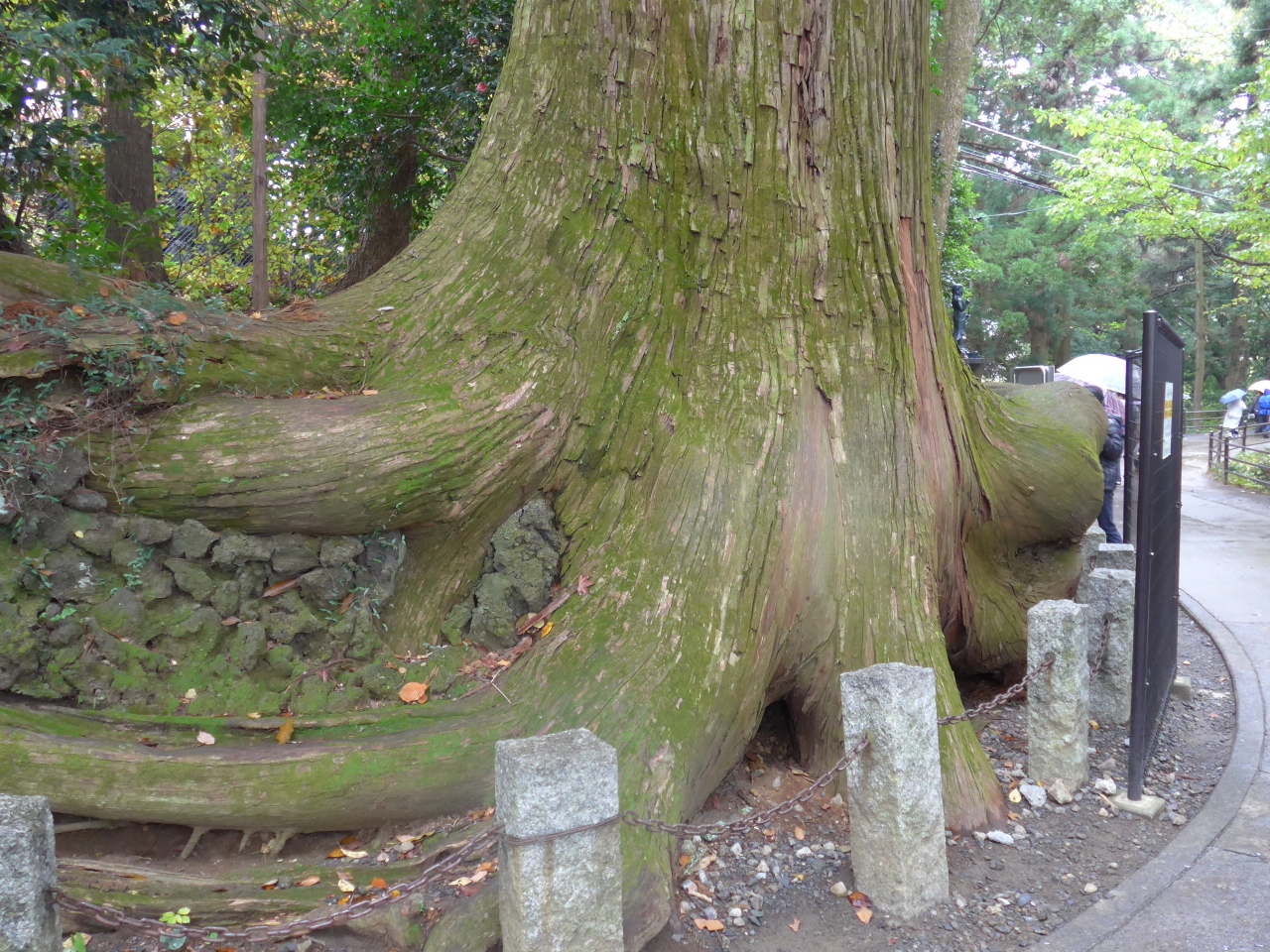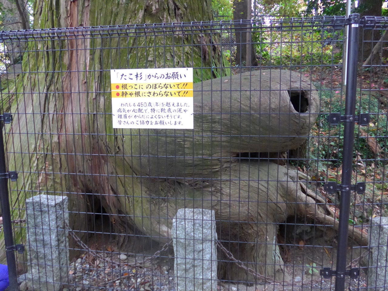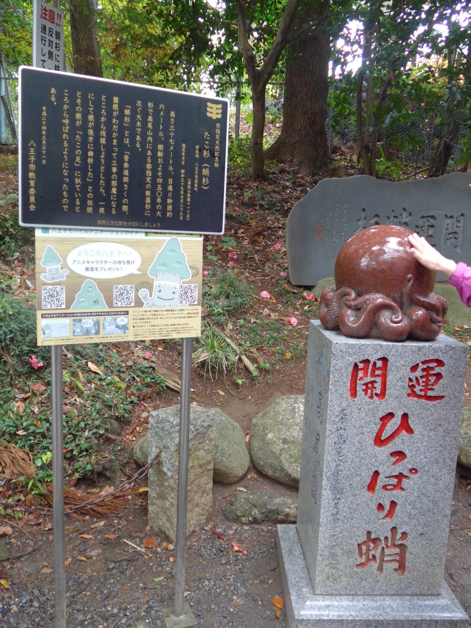 ケーブルカー駅を降りて東京を一望できる展望台があり続いて猿園があります。その先をしばらく行くと柵で囲まれたたこ杉が見えてきます。その横にあるのが「ひっぱり蛸」です。