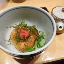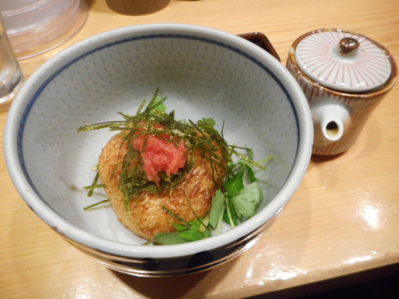 また、焼おにぎりを追加でオーダーしましたが、ふき味噌と明太子が乗り、だし汁をかけて食べるという、料亭で出てくるような上品な一品でした。
