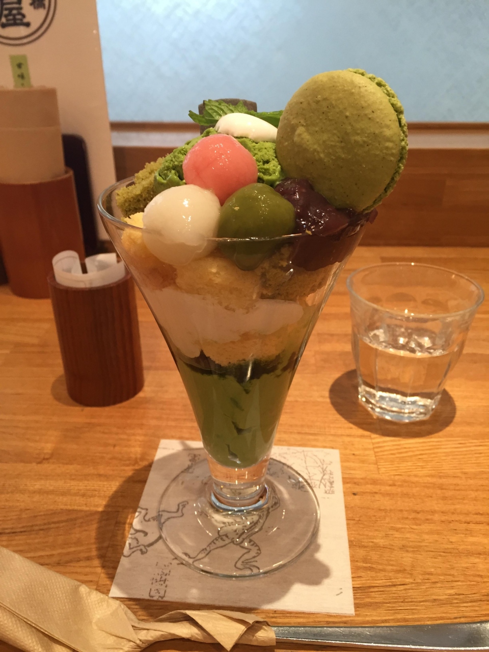抹茶パフェをいただきましたが 白玉 抹茶八橋 抹茶アイス ブラマンジュ スポンジケーキ あずきなどなどいろんなのが入っていて美味しかったです。