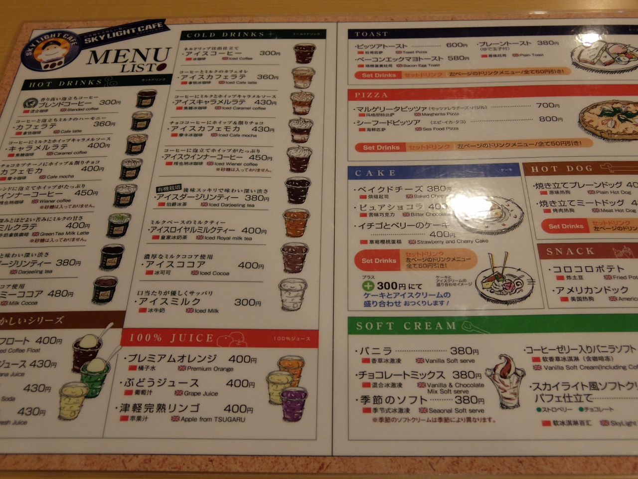 コーヒーを中心としたメニューが中心ですが,トーストやピザ,ケーキ,アイスクリームなどもあります。