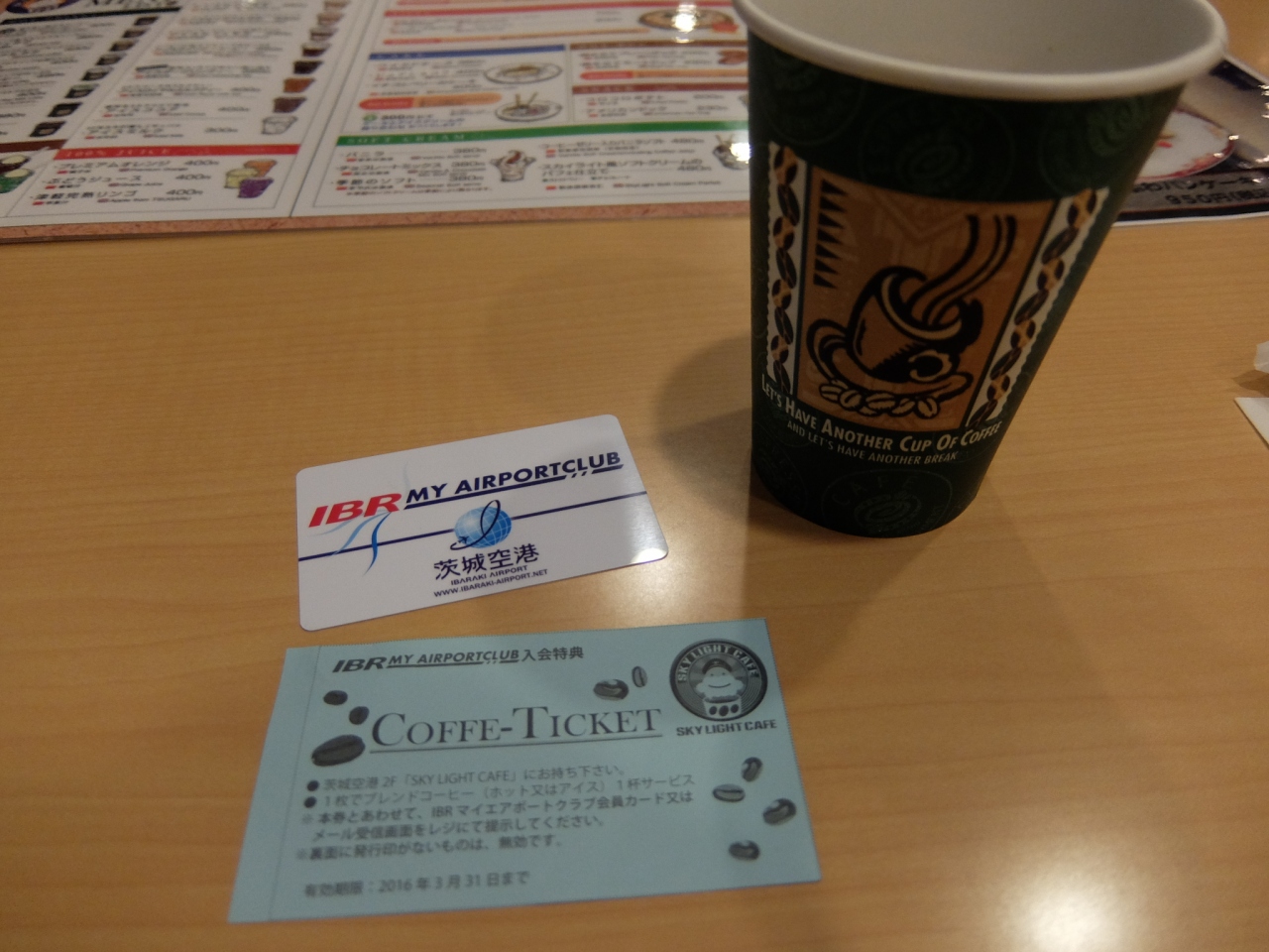 茨城空港のマイエアポートクラブに入会すると,会員証と一緒にコーヒーチケット(2枚)が郵送されてきます。