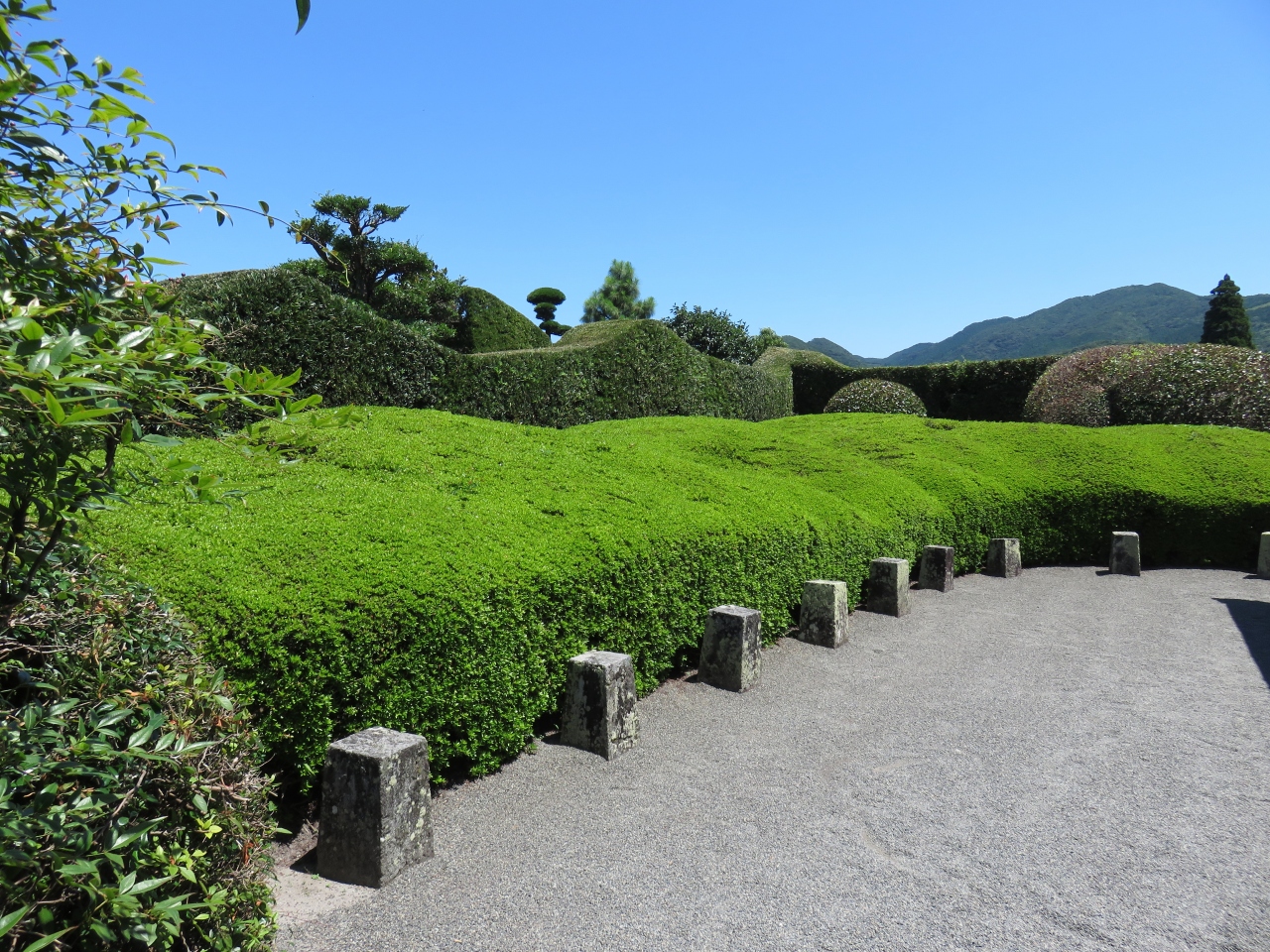 石組みの一つもない大刈込み一式の庭園で母ヶ岳の優雅な姿を