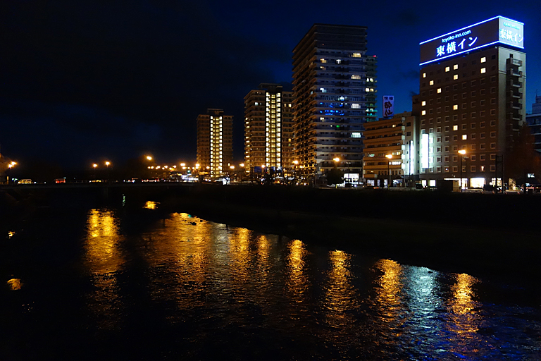 岩手県を流れ、宮城県石巻市で海に流れ込む一級河川です。盛岡駅から近い場所を流れており、開運橋からその夜景を眺めました。街の明かりを川面に映して、綺麗な景色となっていました。