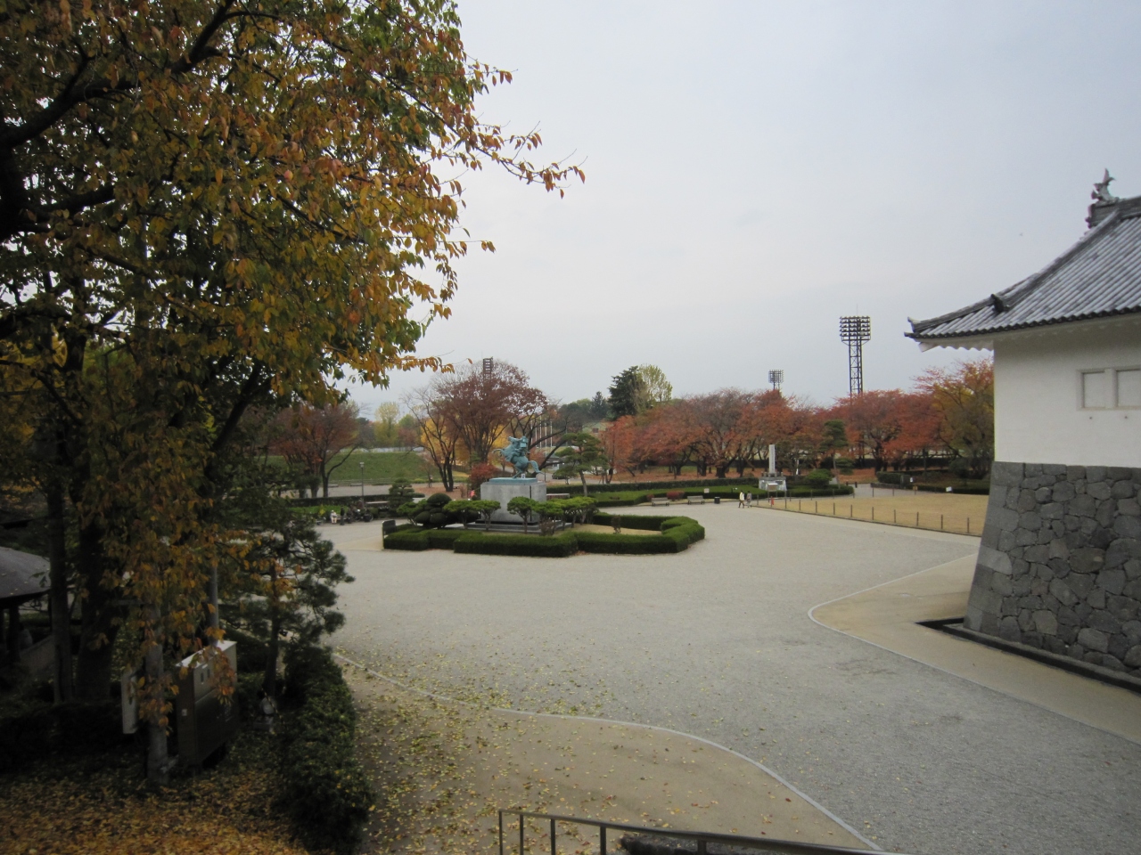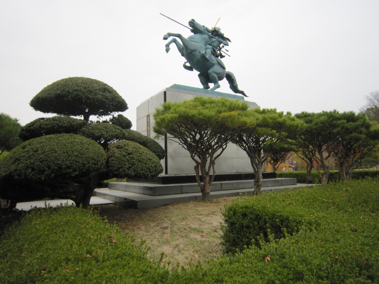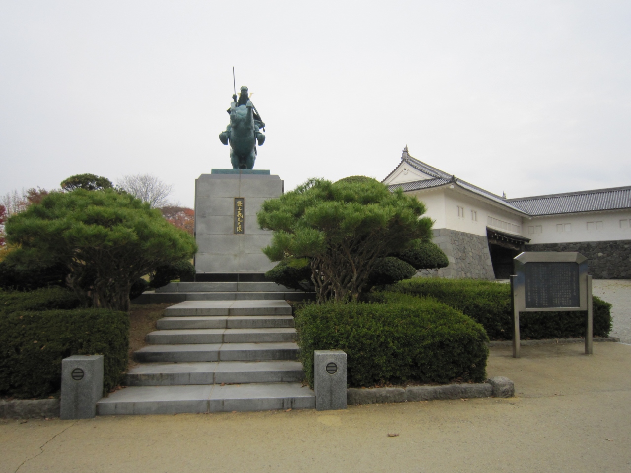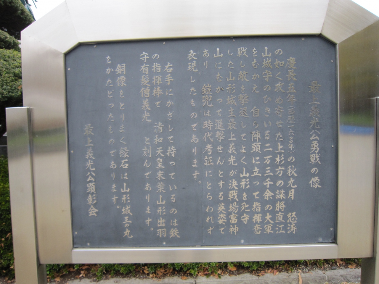 最上義光公勇戦の像、上杉方を向かえ進撃せんとする勇姿、敵を撃退し山形を死守、山形の鋳物で再現しているそうです。二ノ丸東大手門を入り直ぐの所にあります。広い広場の真ん中にあり、さすが山形の英雄であったことが分かりました。