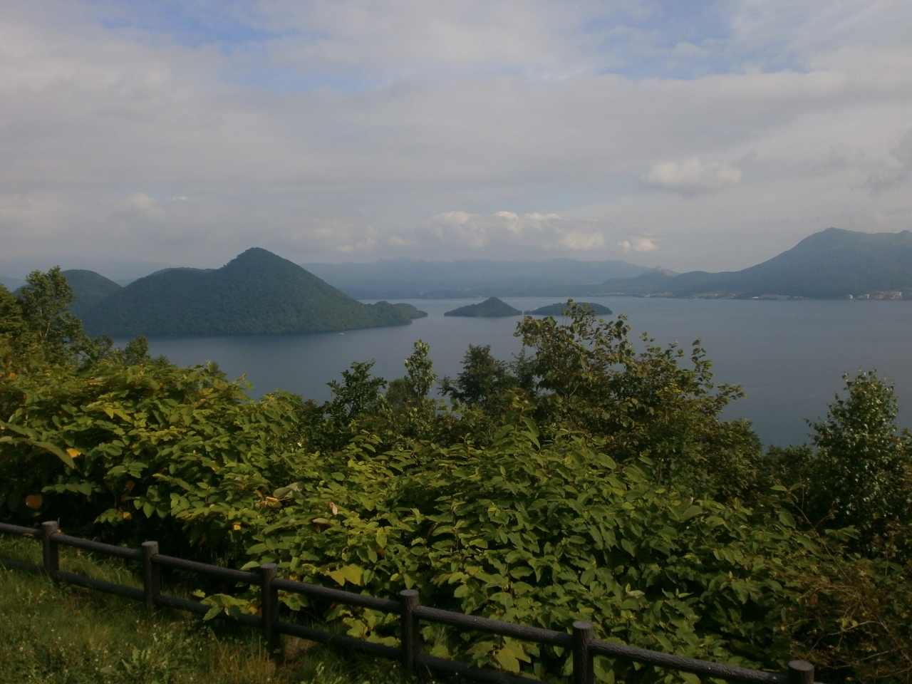 お土産が売ってある建物の中を通り過ぎると、広い舗装された広場があり、その果てに洞爺湖が広がっていました。きれいな洞爺湖が一望できますが、そこに行くまでに、お土産を見たり、2匹のクマの実物大の人形のところで写真を撮ったりと、いろんな観光が楽しめました。