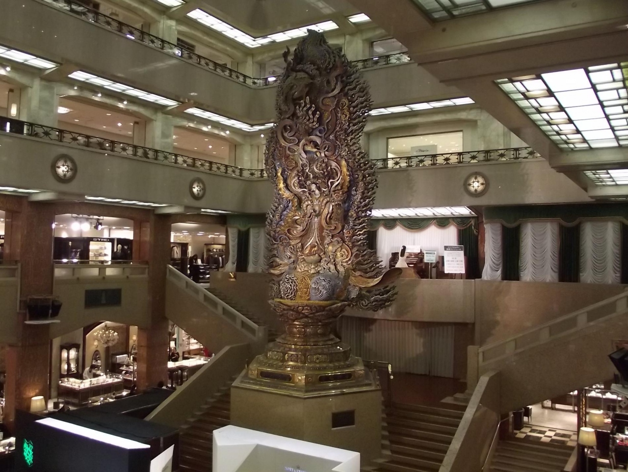 両側のライオン像に迎えられ中に入りしばらく行くと、左手に中央ホールがありその正面には、4階までの吹抜けに天女の像 (まごころ像) がそびえ立っています。