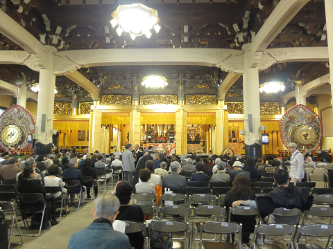 11月16日、初めて行きましたが報恩講の最終日で、本堂で大勢のお坊さん、信者さんが集まっていました。宗祖親鸞上人の命日を通して聖人がお念仏のみ教えを伝え広めたご恩徳を偲び、あわせて阿弥陀如来の御救いを深く味わわせて頂くご法要とのことです。一般の人にも席は解放されていました。お寺の塀には紙芝居のような絵で親鸞聖人の生涯も見られました。
