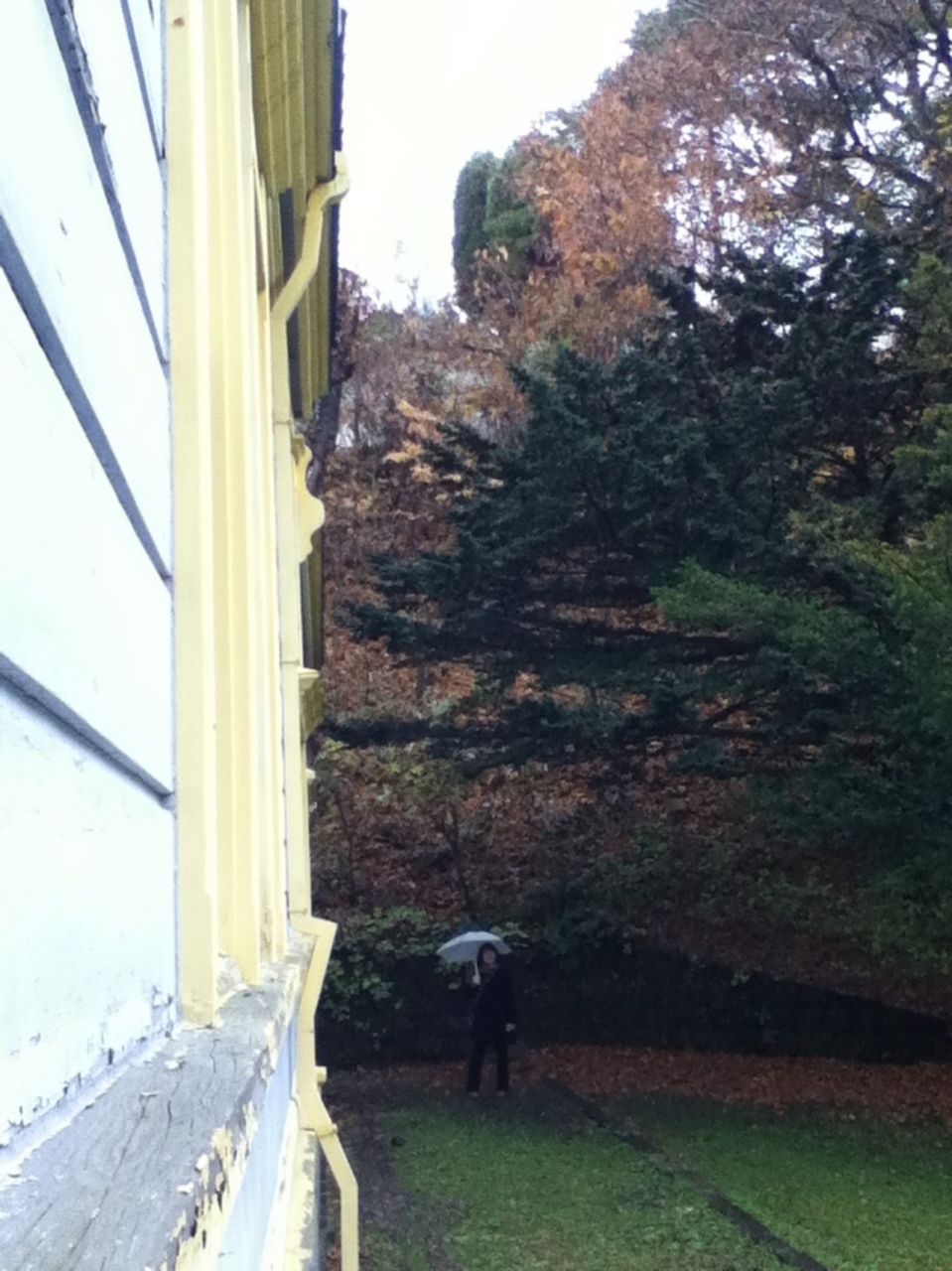 窓ガラスが気になり建物をぐるっと一周しました。裏手からドレス姿のお姉さんが見え、とても楽しそうでした。
