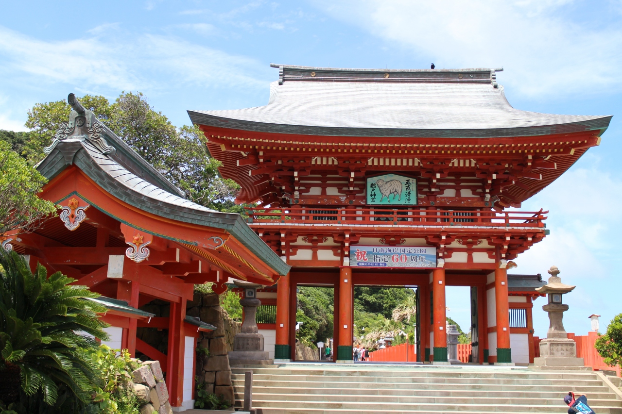 太平洋に突き出した鵜戸崎岬の突端にある洞窟の中に、朱塗りの色鮮やかな御本殿がご鎮座する珍しい神宮です