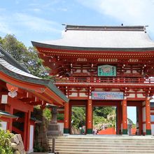 洞窟の中に朱塗りの色鮮やかな御本殿