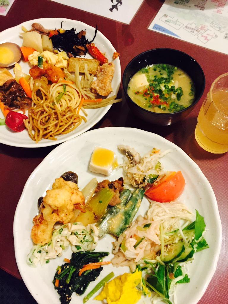 夕食に1400円のバイキングを食べました。少量ずつ皿にとっても全種類制覇できないほど色々な料理がありました。全体的に野菜料理が多く、ヘルシーな献立で、味も総じて良かったです。カレーや鳥天などもありましたが、肉や魚をがっつり食べたい人には物足りないかも。大山町特産の梅干しや梅ジャムなども食べられます。無くなった料理の補充が遅いのが、ちょっと残念でした。