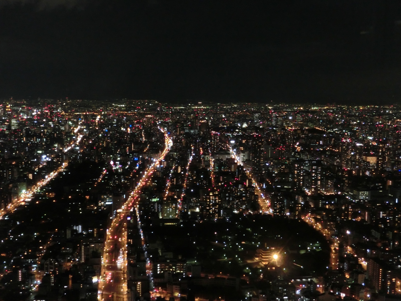あべのハルカスの展望台です。特に並ばずすーっと入れました。昼間登ったこともあるのですが、夜行ったら夜景がとっても綺麗でした。足元のガラスの透けてるところなども楽しいです。夜景見ながら座ってお茶やお酒を飲んだりできるのが良かったです。