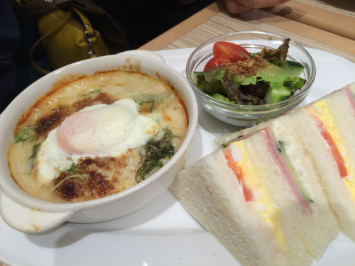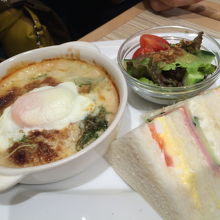 月見そぼろドリアセットには小さなドリアとサンドイッチが半分付いていて、こちらも満足なランチです。