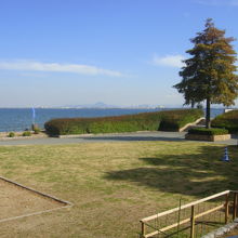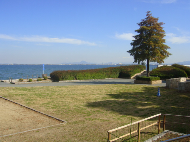 石山駅の近くを流れる盛越川付近から大津港までの湖岸沿いにある公園です。園内には、「おまつり広場」や「サンシャインビーチ」などがあり変化に富んでいます。休日は釣りなどを楽しむ方が多いようですが、平日はご覧のとおりほとんど人影は見られませんでした。ただ遠くに北湖との境にある琵琶湖大橋を眺め見ることができました。