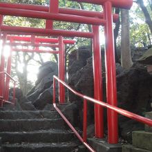赤い鳥居と社殿が鮮やかで印象的な神社ですが、この神社の特徴はゴツゴツした溶岩です。鳥居をくぐりながら、洞窟探検をしているような・・・不思議な気分になります。岩の間から見える社殿がどこか神秘的に見えました。