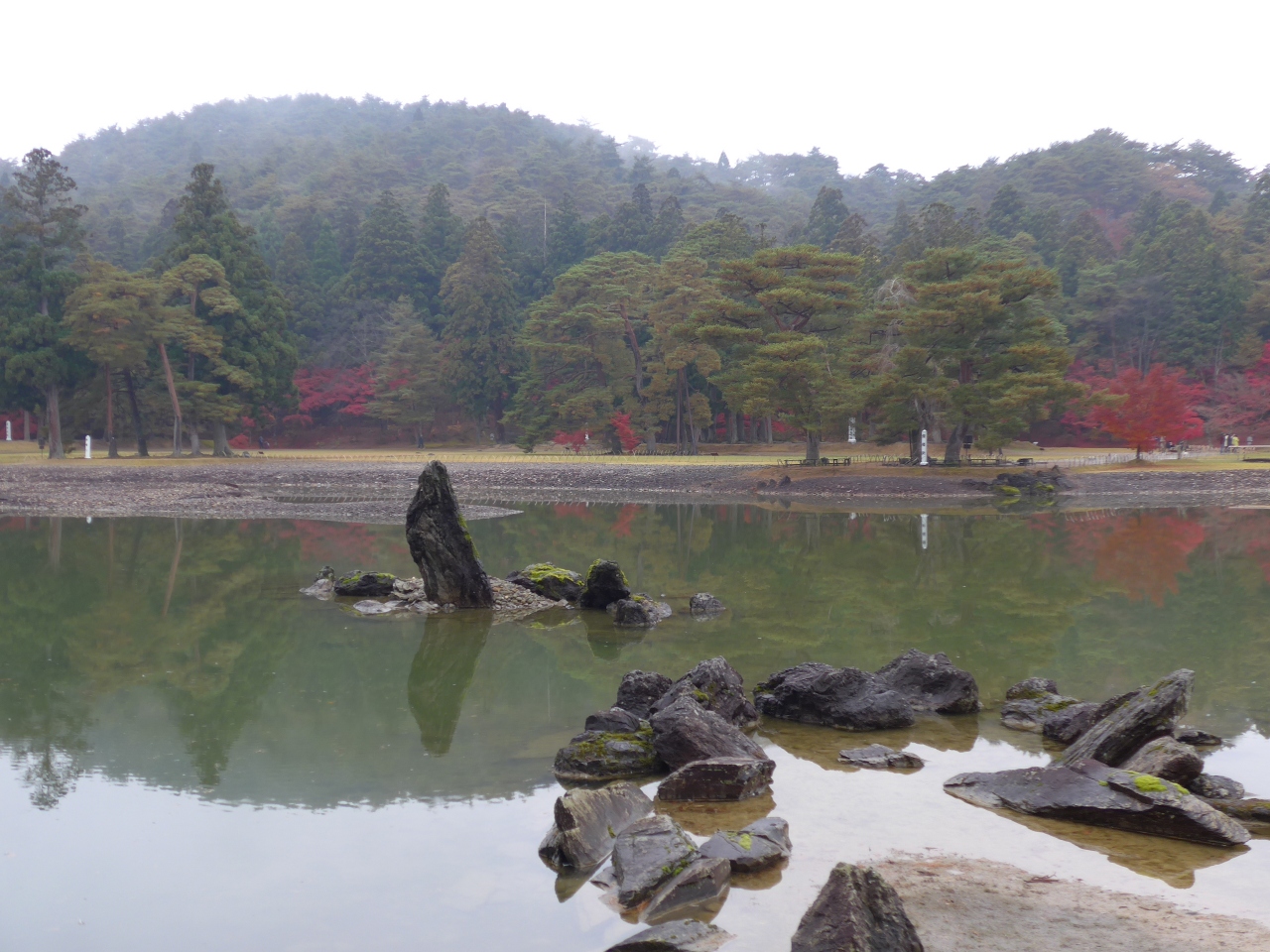 また、発掘されたという池に水を引き入れるための「遣水」がこの出島の正面辺りにあります。ここでは曲水の宴が毎年開催されるとのことで、雅な光景が想像されます。この遣水付近の紅葉が最も赤く綺麗な情景を作っていました。