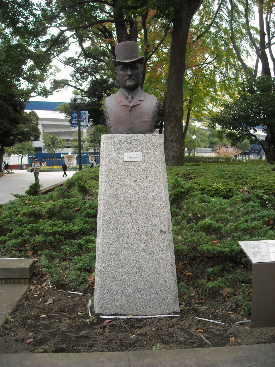 横浜公園内・横浜スタジアム近くに胸像がありました、日本大通り越しに港が見ています。明治初期に土木技師として来日し10年強で白紙に絵を描くように多くの建造物を残しました。技術者冥利に尽きたことでしょう。ここで言う鉄材とは鋳物製品と思います。