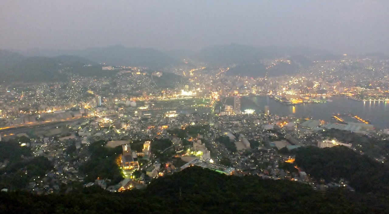 私は黄昏時に到着し、ちょうど展望台の駐車場に停めることができました。長崎駅を付け根として、長崎港を挟むように山々の中腹まで広がる街並み。息を飲む美しさです。