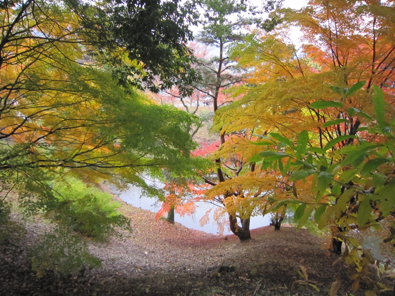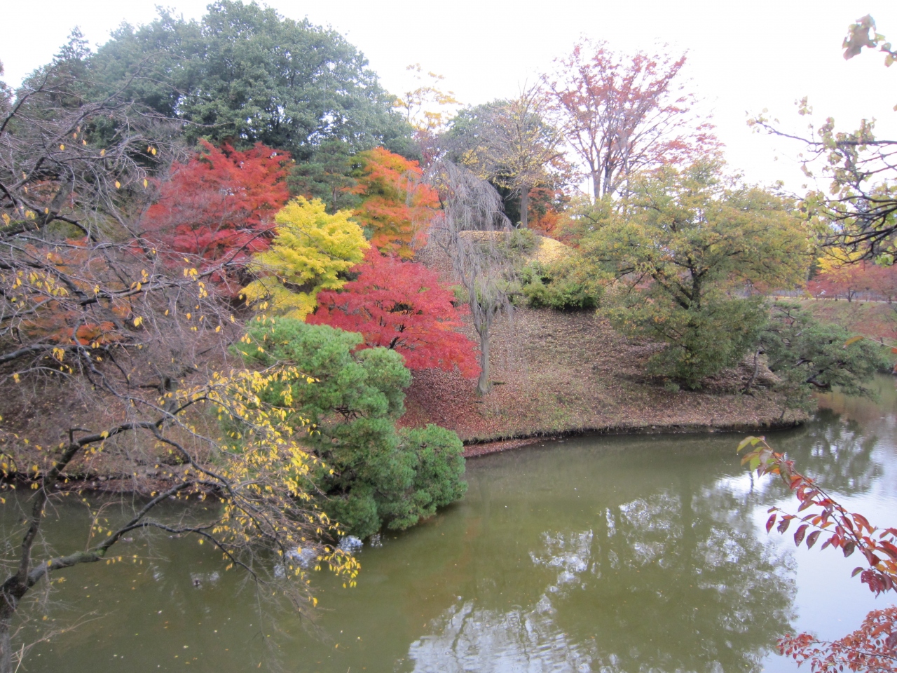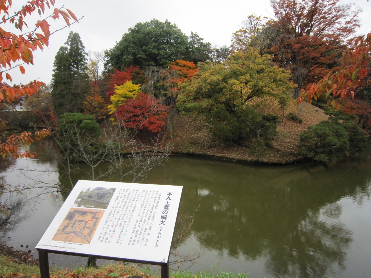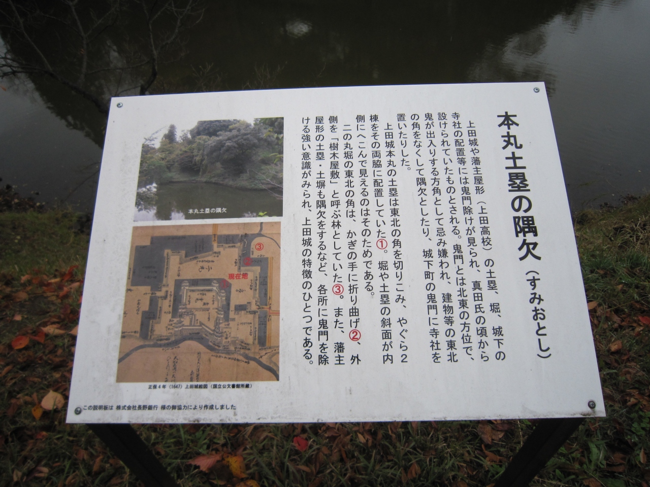 上田城跡公園の右手奥、上田市博物館の先です。本丸の土塁の北東隅を切り込み「鬼門よけ」としたもので上田城の大きな特徴の一つだそうです。本丸跡土塁からも見えます。お堀とその周辺の紅葉がマッチし綺麗でした。
