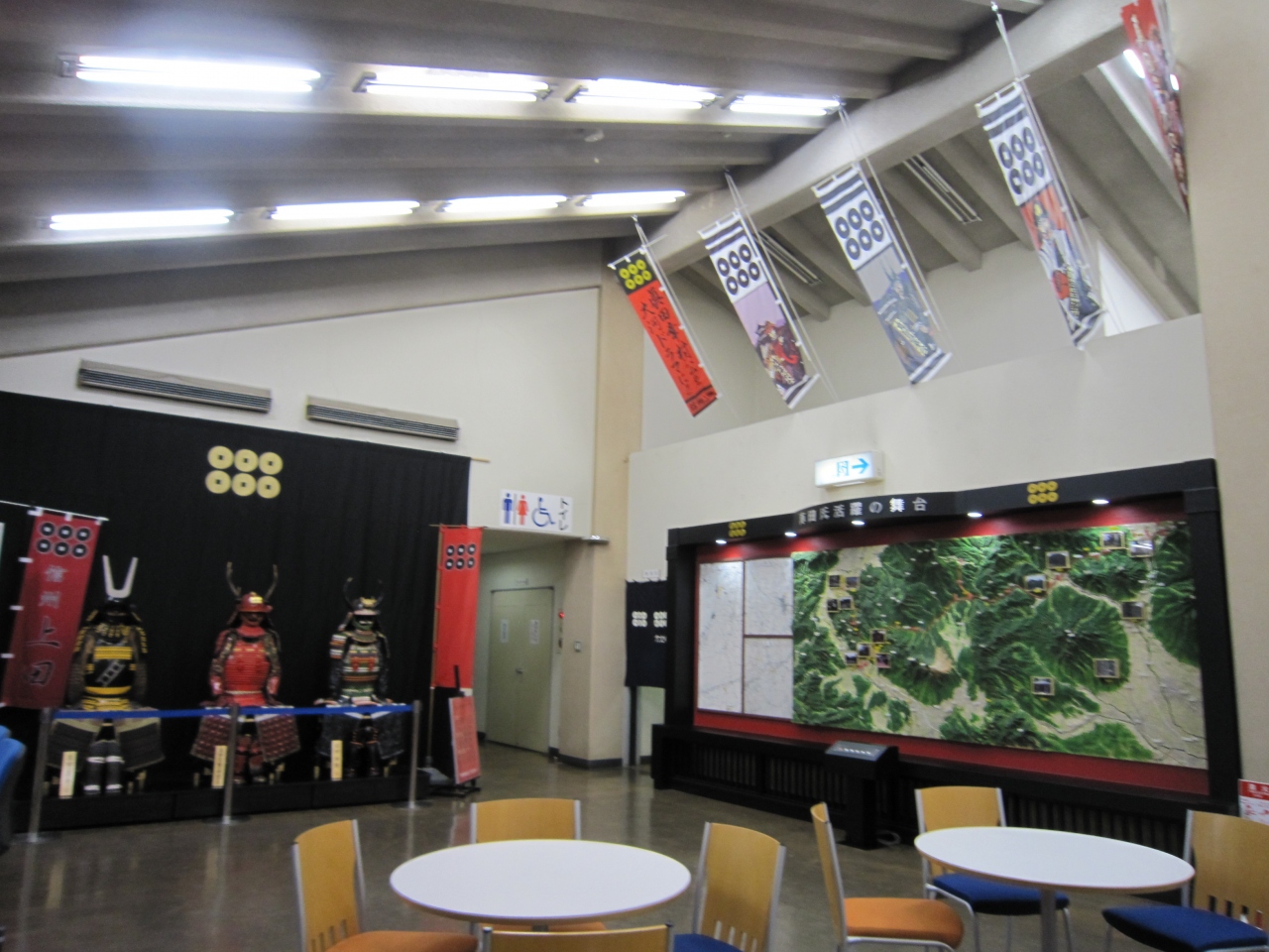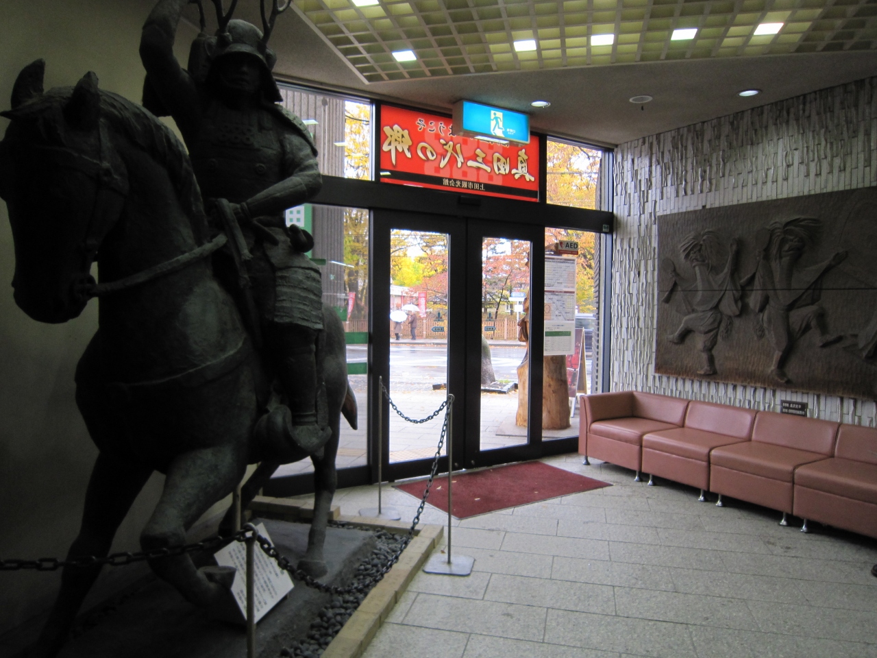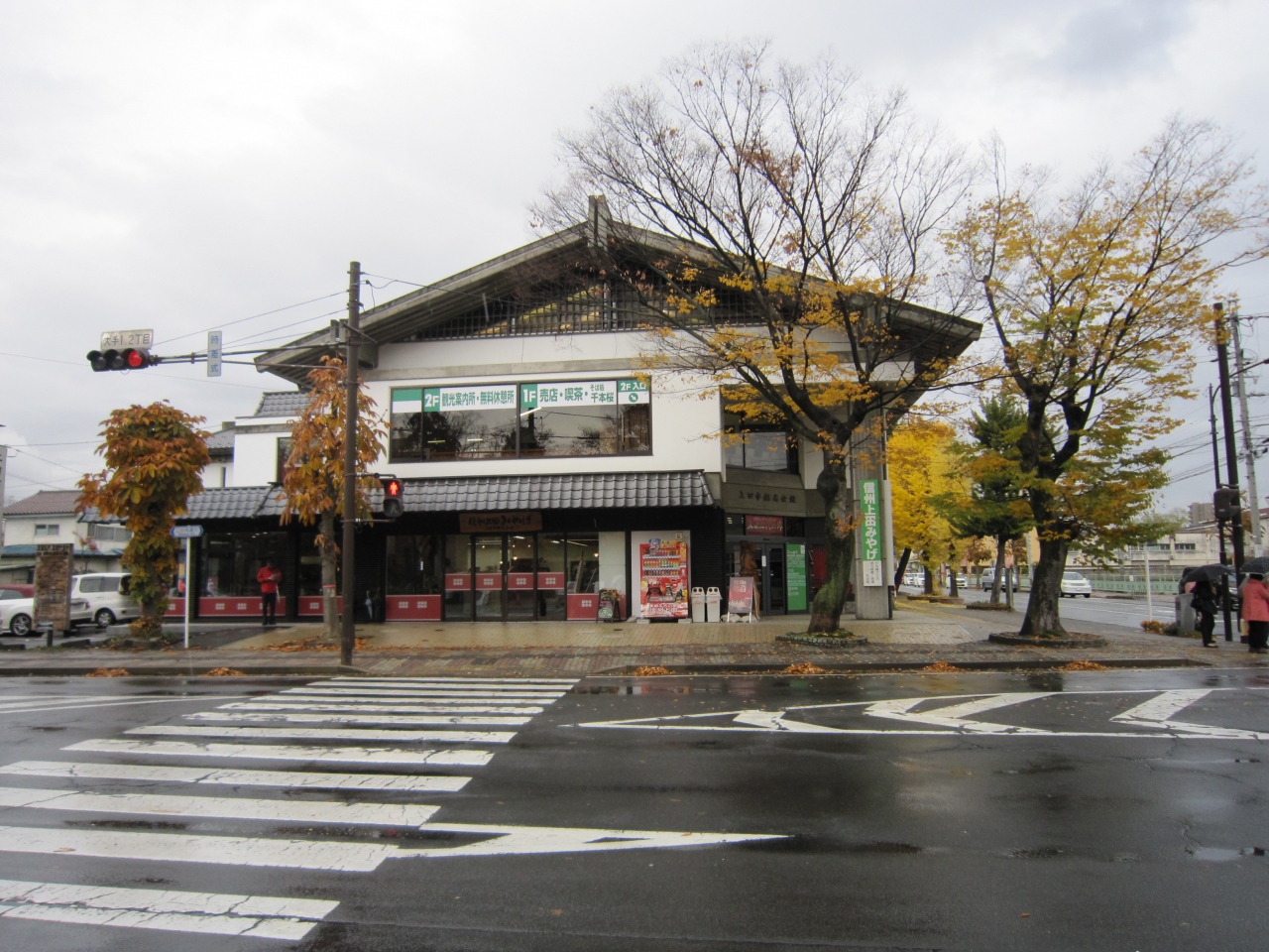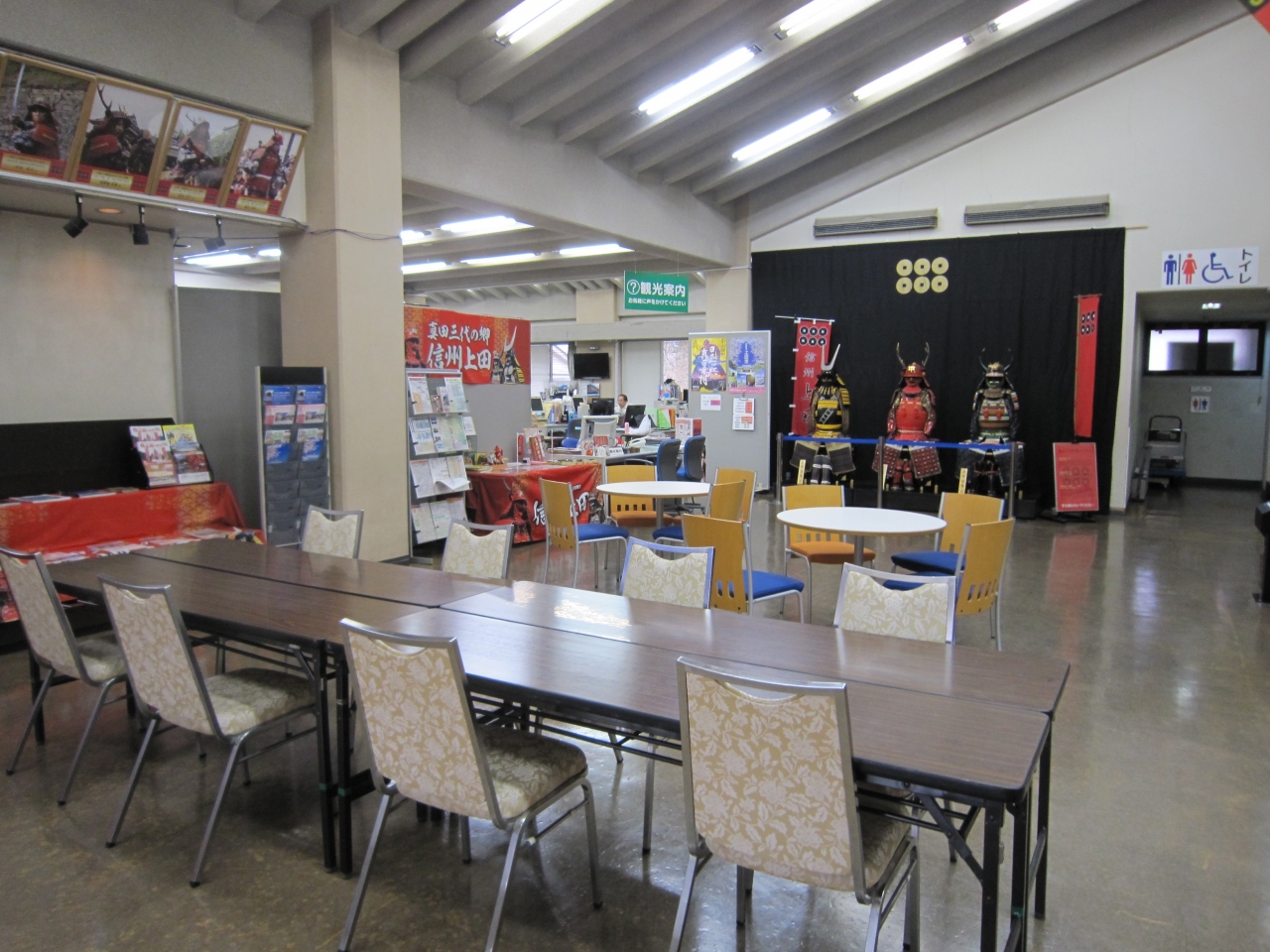 上田城跡公園正門の向かいです。上田城跡を見学後多くの観光客が立ち寄っていました。1Fは地元のお土産品売場、喫茶コーナー、2Fは観光情報コーナーと休憩所になっています。お土産品は地元で採れたクルミ、栗等を使った御菓子や蕎麦、ドレッシング等多数ありました。御菓子は150円前後1個から買えるようばら売りで非常に買い易いです。2Fは上田市近辺の観光案内パンフレットが多数あり、特に映画のロケ地が沢山あるようで映画のポスターを張っていました。テーブルと椅子がありゆっくり休める所でした。