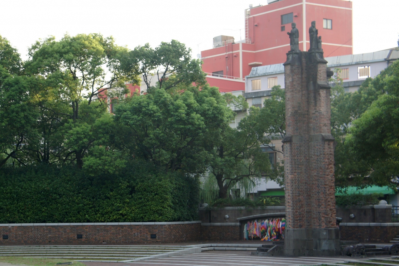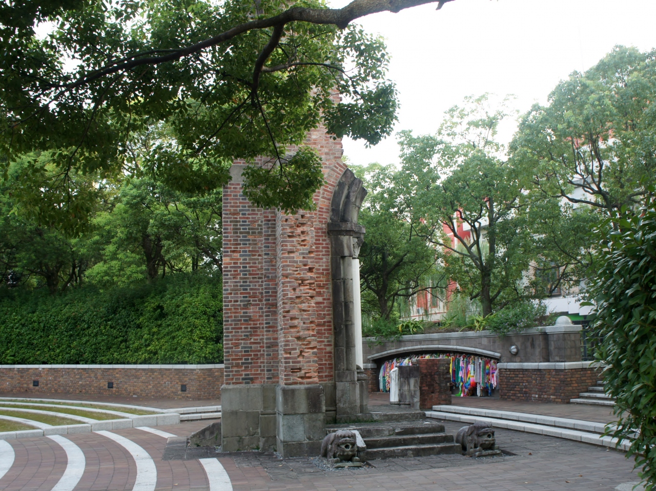平和公園の隣、原爆落下中心地公園の原爆落下中心碑の傍に聖堂の一部が移築されています。浦上天主堂自体は、ここから500m北東にありました。昭和33年に天主堂は元の地で再建されています。