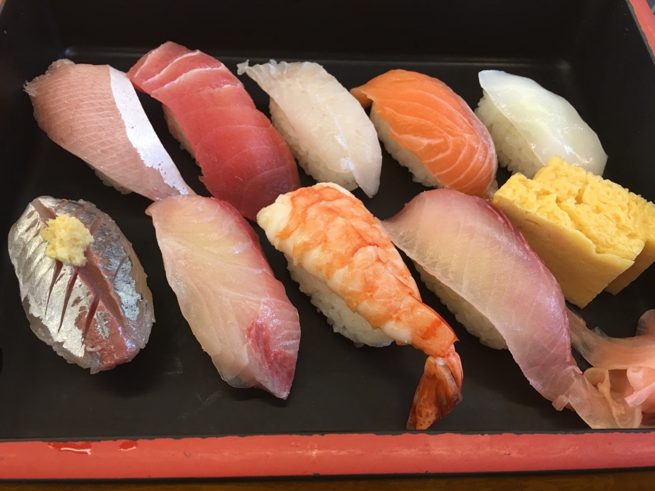私は、握りを頼みました。お味噌付きで1200円。穴子目当ての同行者は「猟師丼」1200円に。隣の家族は「てんぷら盛り」など山もりの揚げ物を頼んでました。