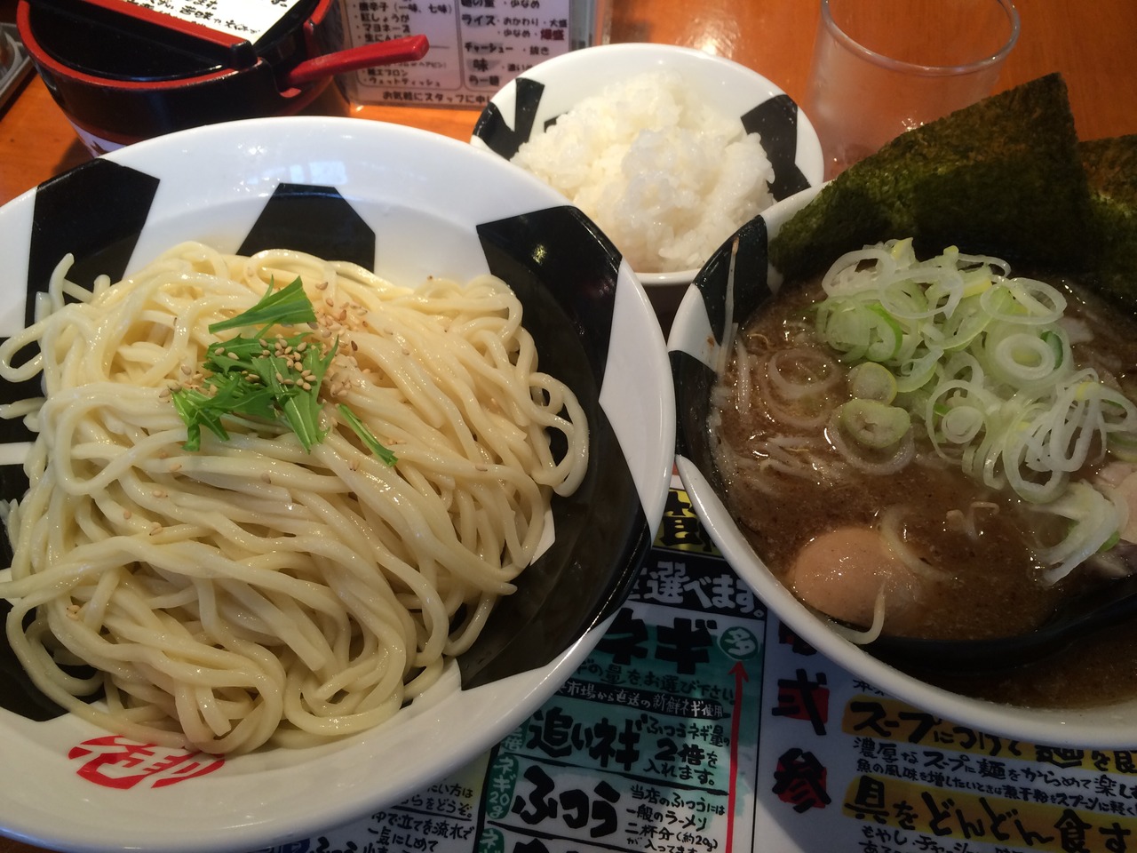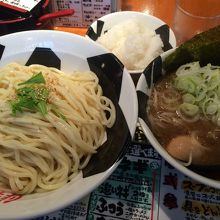 大通りに面したラーメン&つけ麺の店です。すごく頭の悪そうな外観です(笑)。毎月24日は節の日だとかで、節つけ麺が500円。これに惹かれて行ってみました。店の前に長蛇の列ができています。先に食券を買ってから並ぶシステムなので、列が進まないからといって途中で離脱はできません。途中でかわいい女性の店員さんが食券のチェックにやってきたりします。麺の量は同料金で並・中が選べますので、中でお願いします。麺の温度はひやで。ネギ増しにしてもらいます。さらに、ランチサービスのライスももらいました。