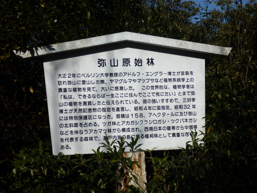 宮島ロープウェーで弥山原始林を見下ろしながら進んできましたが、霊火堂から干満岩に向かう登山道に弥山原始林についての看板が出ていました。ベルリン大学のアドルフ博士がヤマグルマやマツブサなど植物系統学上、貴重な植物があることに感動したそうです。