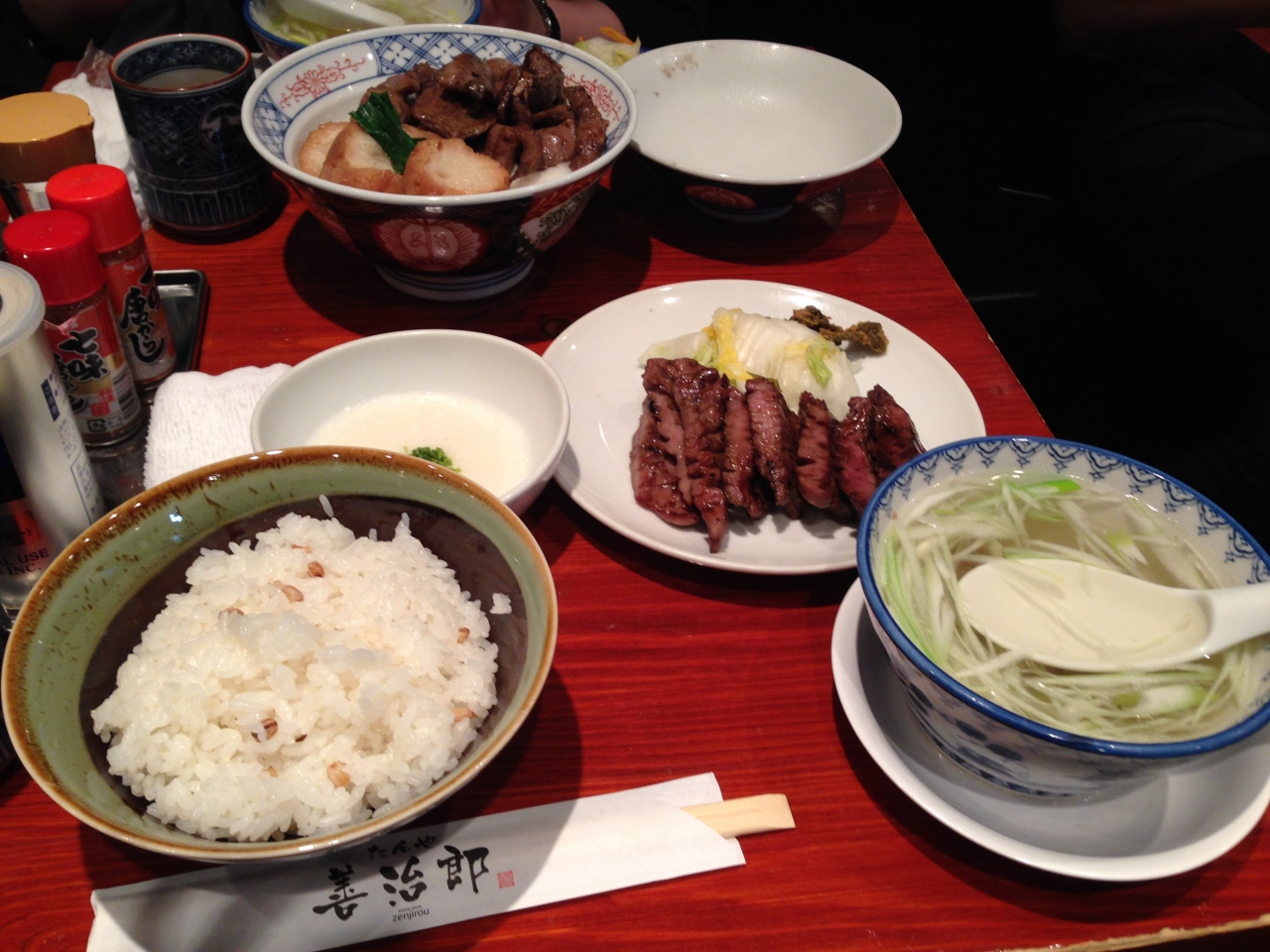 仙台駅の3階にある牛たん通りに行きました。遅めの晩御飯でしたが、どこのお店も混んでいて、比較的空いていたのが善治郎でした。牛たん定食は炭火で焼いた牛たんに麦飯、とろろ(もしくはサラダ)、テールスープがついてきます。ボリュームたっぷりで美味しかったです。
