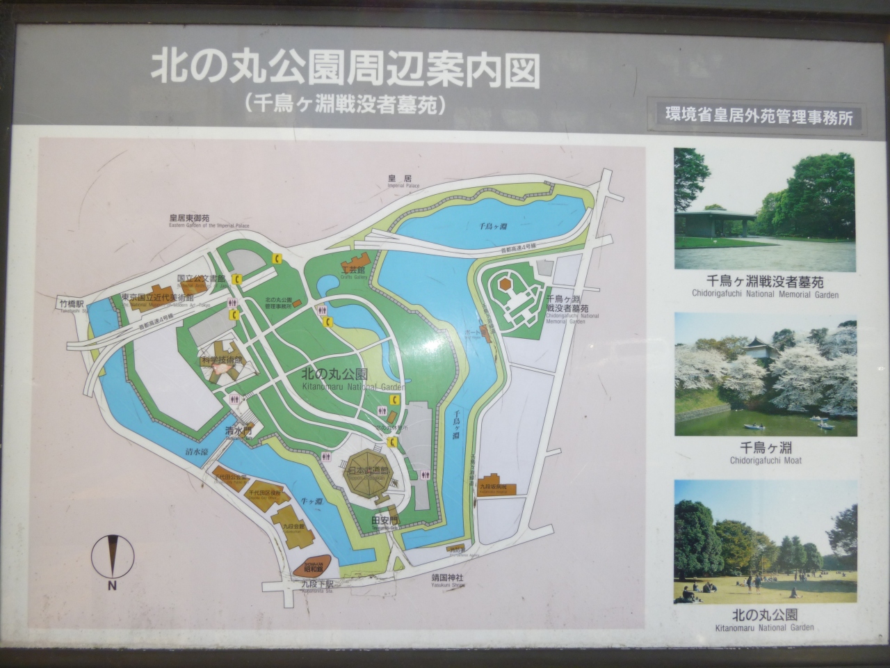 東京メトロや都営地下鉄の九段下駅から靖国神社方面へ向かってお堀沿いの田安門橋から田安門を潜って中に入るとそこが北の丸公園です。