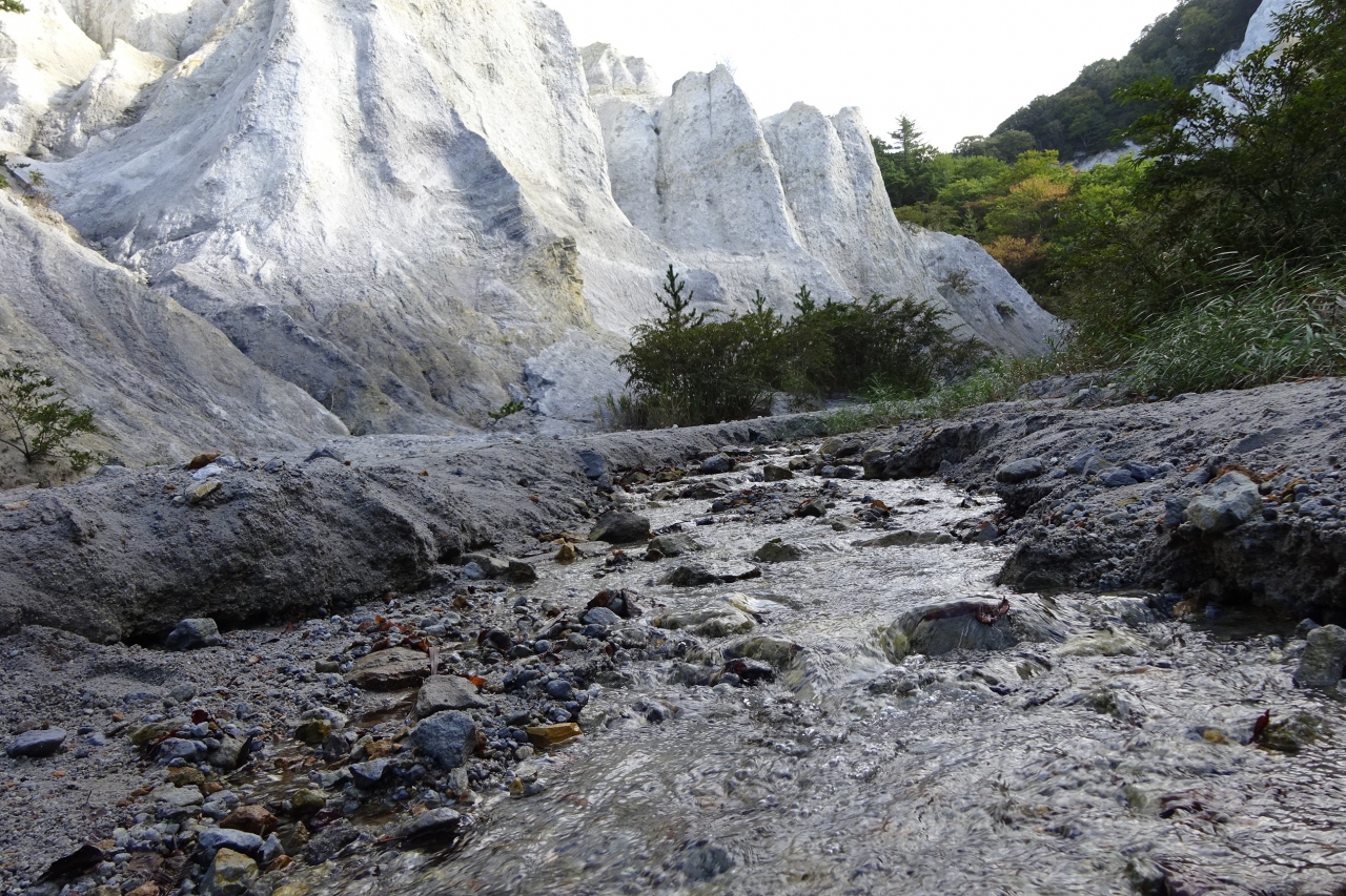 展望台もあるようですが、私は少し手前の橋の横から日本キャニオンの下へ行ってみました。歩いて10分程度だったと思います。遠くから見るとよくわからないのですが、真下まで行くと結構高くて見応えはあると思います。触ってみると岩というよりはチョークの様な感じでした。