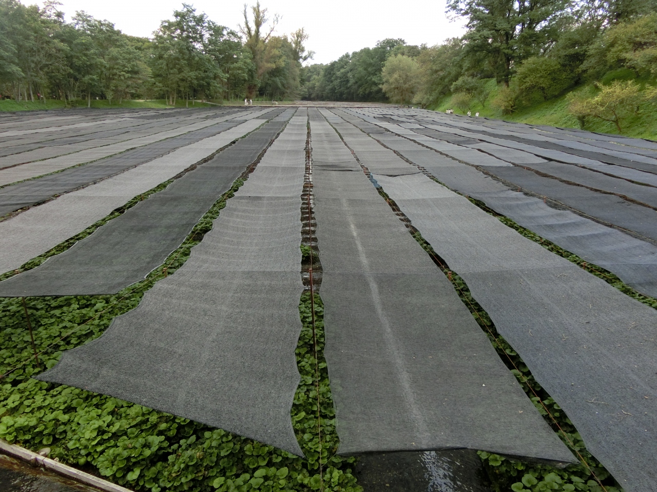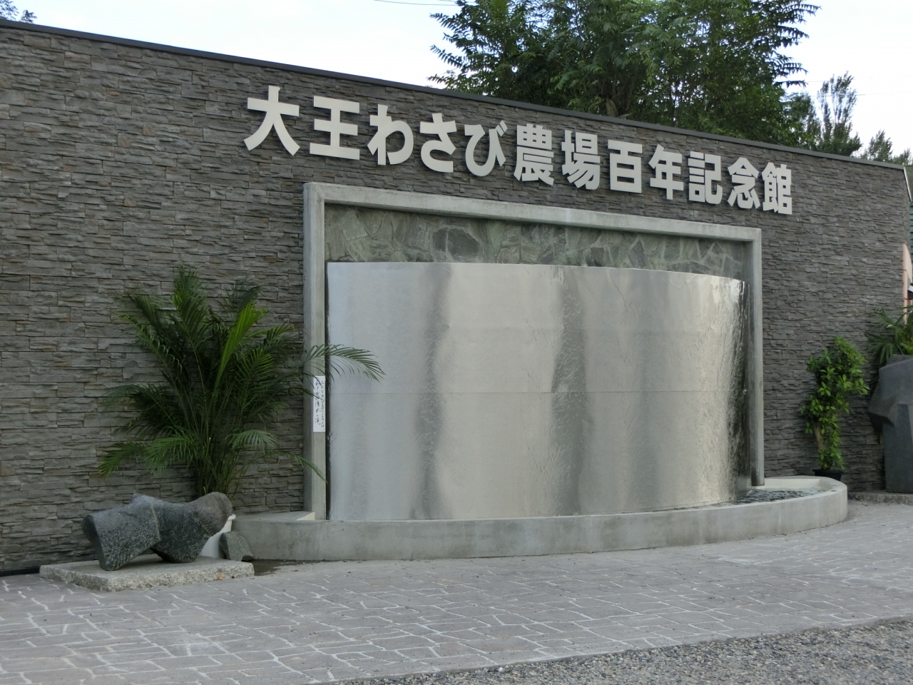農場内に入場して目に飛び込んだ景色が、一面の黒の遮光ネットの広場、その下にわさび畑がありました。わさびの日焼けをふせぐためだそう。また敷地内には二本の川が流れており、敷地の広大さが実感されました。場内の散策に2時間余り要するとのことでしたので、売店を中心にわさびソフトやわさびコロッケを食べながら、ショートカットで場内を散策しました。