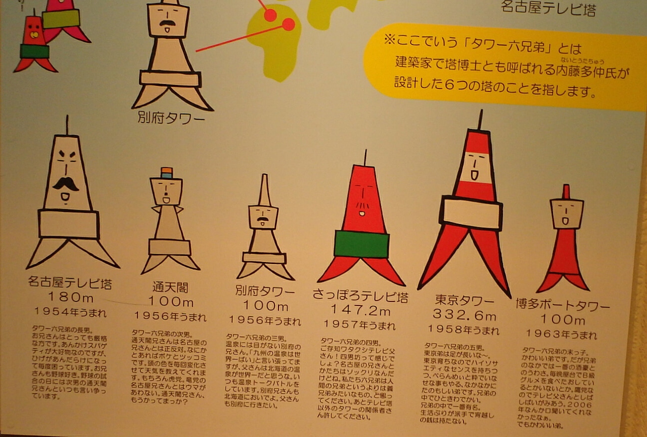 名古屋のテレビ塔に似ている形をしていますが、塔内部の案内板によれば、いずれも、塔博士と呼ばれる内藤多仲氏による設計だそうです(他に、東京タワー、博多ポートタワー、通天閣、別府タワーがあり、「タワー六兄弟」と呼ばれているとか。
